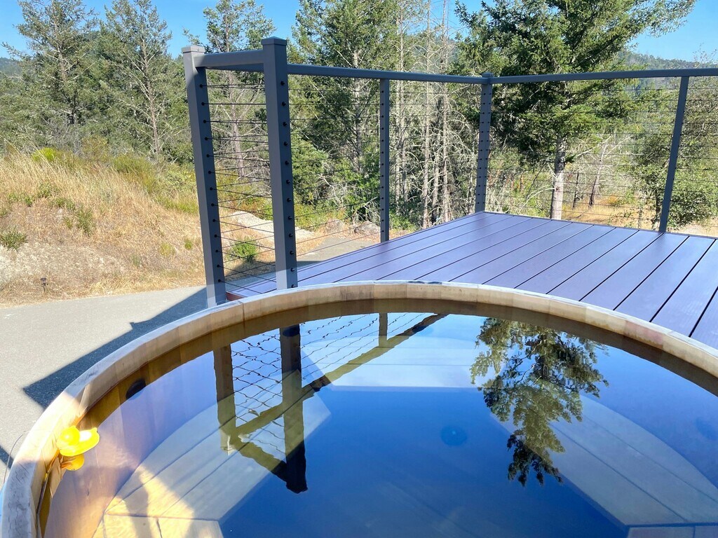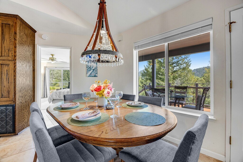 Mountain Villa with Hot Tub 2 bd | 2 ba | 1414 sqft house for rent 323 Bodmer Ln. off Calistoga Rd. $5995/month This unique spot in the mountains between Napa & Sonoma Valleys is 10 minutes from Calistoga & 13 minutes from highway 12 through Sonoma Valley. You’ll have fantastic views of the mountain forest and constellations in the night sky, while sharing the property with deer & other wildlife. You will immediately notice the quiet nature & the smell of trees. There are many attractions nearby, including Russian River, Safari West, Petrified Forest, various hot springs & wineries galore to explore. This comes fully furnished. It is currently rented on Airbnb so it has everything you need already on site. The Villa shares a gated 9.2 acre country estate with one other house. It is 1,414 square feet so rooms are large. There are decks on three sides of the house with an outdoor dining area and lounges for star gazing. Get your relaxing hydrotherapy in our luxurious Alaskan Cedar Hot Tub that can fit 6-8 people The main room combines a living room, dining room and kitchen in an open bright space. The 75 inch TV is connected to a Roku streaming device and a surround sound system which you can also use to play your music via Bluetooth. This is a large open space with room to dance! Each bedroom has a bathroom attached and one of these is also accessible via a door to the laundry room off the main room. The couch in the living room pulls out to a queen size bed. One of the bedrooms can be configured as a king bed or 2 single beds. This is setup to work from home: it has Starlink internet, 2 standing desks, a laser printer, and an espresso machine. The property has a backup generator that runs when PG&E cuts off power. The property is on a private road with 5 neighbors near the top of a mountain. It is rural and quiet, though you may occasionally hear a neighbor’s goats at feeding time. Mostly what you will see are trees and wildlife. Sunsets can be spectacular from up here. There are vineyards and a few wineries along Calistoga road.