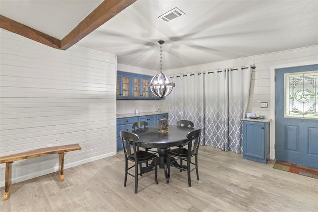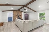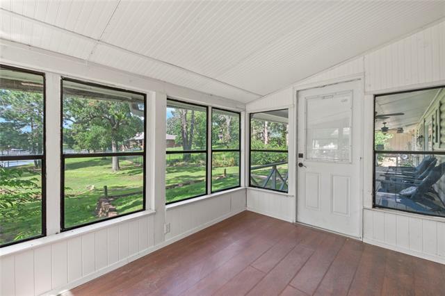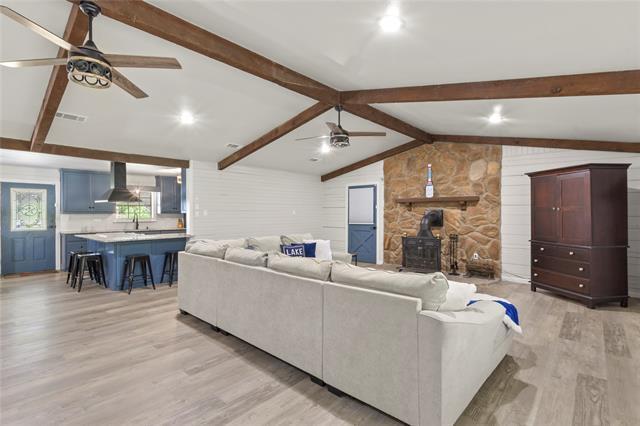 This adorable log cabin sits on over two and a half lots and has that perfect blend of cozy charm and modern comfort. Step inside to find vaulted ceilings with wood beams, a warm wood-burning stove, and a bright open layout that feels instantly relaxing. The kitchen has been nicely updated with granite countertops, newer cabinets, and luxury vinyl plank flooring that flows throughout. You’ll love the open floor plan, the dining area, kitchen, and primary bedroom all look out toward the water, filling the home with beautiful lake views. The primary suite opens to a private screened-in porch and connects to the covered patio, making it easy to enjoy morning coffee or evening sunsets outdoors. From there, step down to a spacious backyard and your own updated boat dock with a party deck. All perfect for summer days on the lake. There’s also an attached carport with easy access to the kitchen, an RV carport with hookups, an 800 sq. ft. workshop, and plenty of parking for guests, toys, or watercraft. Pet-friendly and full of character, this lake house is ready for someone who wants to relax, entertain, and enjoy the lake life to the fullest.