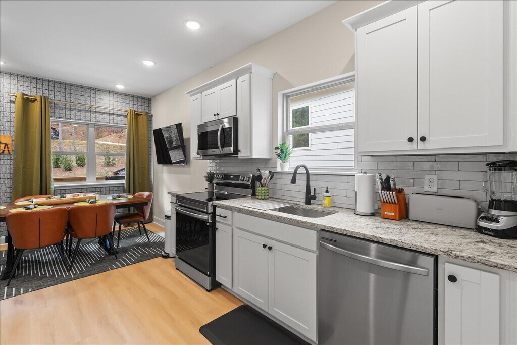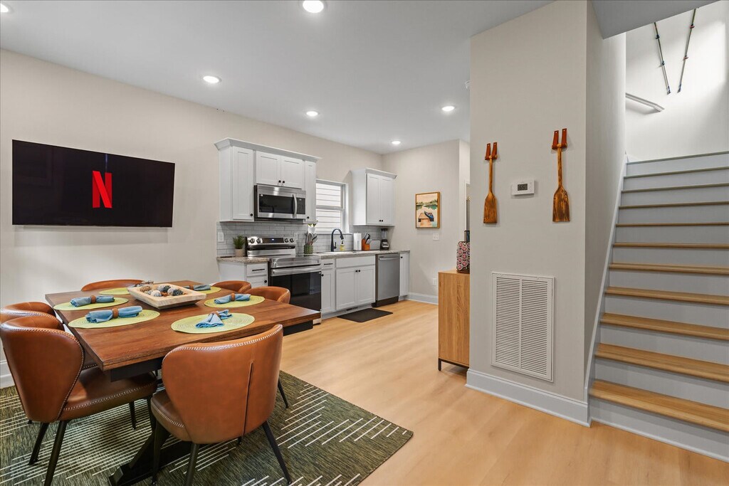 Feel at home in this 3-bedroom home in Chattanooga, offering the perfect blend of comfort, convenience, and scenic charm. This home comfortably accommodates up to 9 guests and features open and cozy living spaces, a fully stocked kitchen with high-end stainless appliances, ample cabinetry and cooking space, and a Keurig coffee maker. For entertainment, all five TVs feature DIRECTV streaming. Step outside to unwind on the deck, enjoy the outdoor TV, relax in the hot tub, or lounge on the comfortable patio furniture. There is also a fire pit and a washer and dryer for your convenience. Up to 2 dogs are allowed for $125 per stay, no cats please. Parking is available for 2 vehicles in the driveway. Nestled near the Tennessee River and surrounded by the natural beauty of Lookout Mountain, this home makes an ideal base for families and groups looking to explore Chattanooga’s best attractions. Nearby attractions include Lookout Mountain (4 mi), Ruby Falls (4.5 mi), Rock City Gardens (6 mi), Incline Railway (5 mi), and the Tennessee Aquarium (6.5 mi). You can also enjoy nearby restaurants such as Public House Chattanooga (6 mi), Common Table Chattanooga (5 mi), Tony’s Pasta Shop & Trattoria (7 mi), Portofino’s Greek & Italian Restaurant (5 mi), and Tupelo Honey (6 mi). No parties are allowed, and violations may result in immediate termination of the stay. An exterior camera is installed solely to monitor the cleaning team for quality and security purposes. Guests must be 21 years or older to book this property. Check-in is at 4pm and check-out is at 10am. We kindly ask that your dog is crate trained and that you pick up after your dog. Includes a dedicated workspace in bedroom 1. [SI]