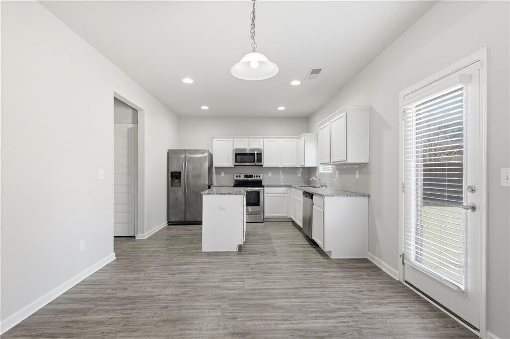 Welcome home to this beautifully designed Decatur home featuring a bright open concept floor plan and modern finishes throughout. Step inside to spacious living areas filled with natural light and thoughtful details. The kitchen is the heart of the home with granite countertops,a large island,white cabinetry,stylish backsplash,and stainless steel appliances including the refrigerator and washer. The oversized primary suite offers a private sitting area,large shower,seperate tub and a large walk in closet. Three additional generously sized bedrooms share a full bath,providing plenty of space for family or guests. Custom flooring enhances the main level,while plush carpet upstairs adds comfort. Enjoy a flat backyard surrounded by nature,perfect for relaxing or entertaining,with lawn care included in the rent. The upstairs laundry room adds everyday convenience. Move in ready in a prime Decatur location close to shopping,dining,and major highways. Schedule your showing today. MLS ID 7720533