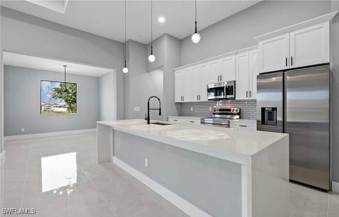 Beautiful 2024 new construction home located on El Dorado Boulevard,one of Cape Coral’s well-known streets,offering convenient access to major roads and main routes. This property features 3 bedrooms and 2 bathrooms with a modern,open-concept layout,ideal for comfortable Florida living. The home is equipped with impact-resistant windows and doors,city water,and includes a fully fenced yard,perfect for pets,privacy,and outdoor enjoyment. Interior highlights include tile flooring throughout,quartz countertops,contemporary cabinetry,and bright living spaces filled with natural light. The kitchen opens seamlessly to the main living area,making it ideal for entertaining. Additional features include a 2-car garage,ample outdoor space,NO HOA,and close proximity to shopping,dining,schools,and everyday conveniences. An excellent opportunity to own a move-in-ready,brand-new home in a desirable and growing area of Cape Coral.