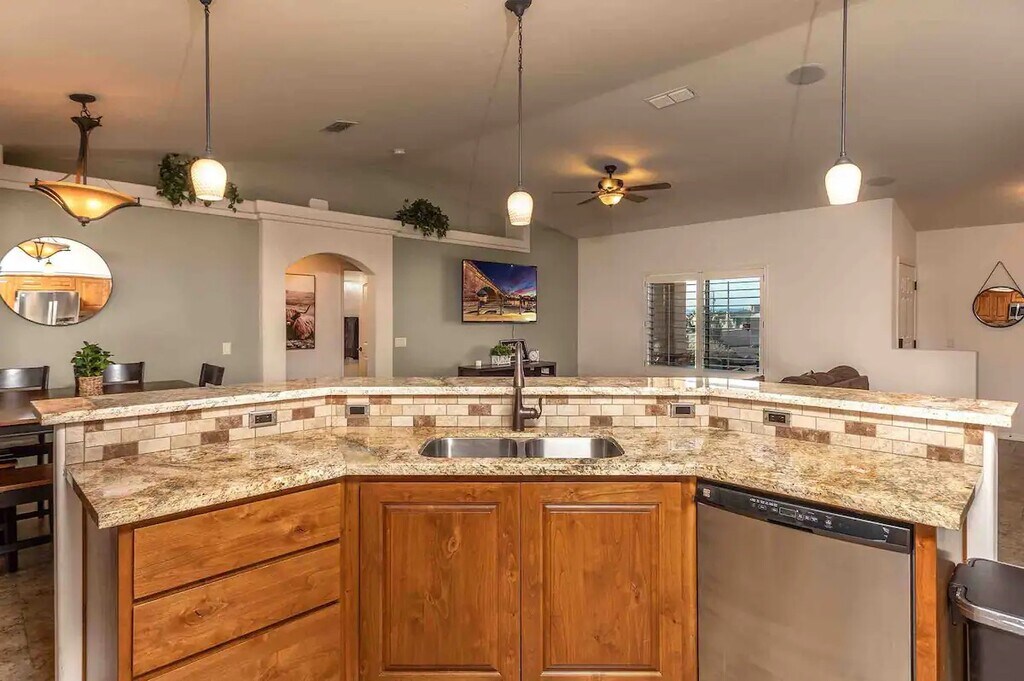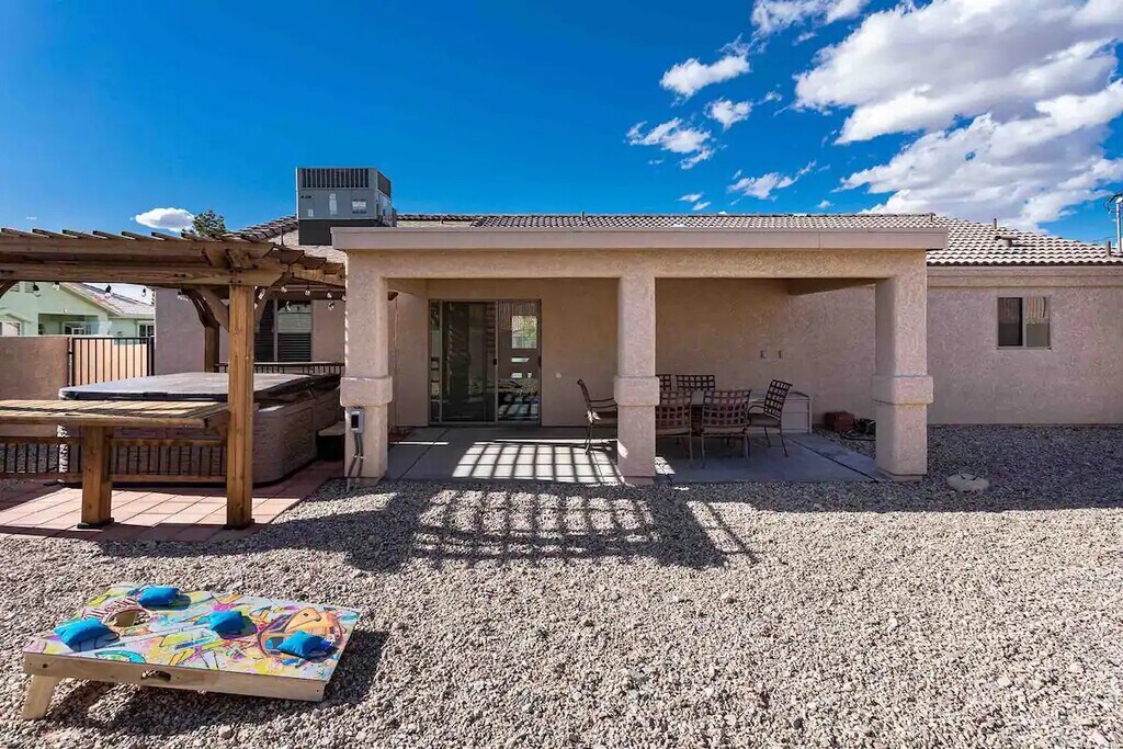 Home away from home! 3 bedroom 2 full bath with a spacious floor plan. 3 miles from the famous London Bridge. Short drive to downtown, bars, launch ramps, shopping centers and much more. Fully fenced in backyard with private RV or toy storage access. Plenty of parking in the circle drive driveway or side yard. Beautiful new hot tub with pergola and outdoor dining set. High speed WiFi for cozy movie nights. New AC unit, washer and dryer & fully stocked kitchen. Come and stay awhile!! LIVING SPACE >Open concept with the dining/kitchen area >Comfortable couch >Smart TV with HBO Max, Netflix, Apple TV, Hulu, Amazon Prime DINING/KITCHEN >Kitchen island >Fully stocked kitchen >4 barstools at the kitchen island >Keurig coffee maker >6-seater dining table BEDROOMS >1) King bedroom with ensuite bathroom and walk in closet, Smart TV >2) Queen bedroom with closet >3) Full over full bunk bed with a full trundle >Extra queen air mattress BATHROOMS >Full bathroom attached to king room (walk in shower, dual vanity) >Full bathroom (tub/shower) EXTERIOR (FRONT) >On the main street that takes you to all the entertainment! (couple minutes away from Mcculloch Blvd main street and the famous London Bridge area) >Large driveway/circle drive for boats or toys (no garage access) >Front porch seating >RV/toy side yard behind gate >Ideal size boat would be 20foot in order to maneuver on driveway/circle drive without having to backup EXTERIOR (BACK) >6-seater outdoor dining table under covered patio >Corn hole >Hot tub under pergola >Lots of space for games and activities >High backyard walls for privacy >BBQ Grill Guests will have full access to the home minus the pantry and the garage We want your vacation rental experience to be memorable and convenient. Keeping a comfortable and clean property is what is most important to us. We will be available anytime via messenger to answer any questions or concerns. We take the approach of being hands off on the property unless needed - we want you to feel like you have the home all to yourself! Very close to Downtown, bars, shopping centers, launch ramps, parks, very centrally located Driving, Uber/Lyft, bikes, razors, shuttle services are available as well. CAMERAS >Ring front doorbell >Front yard *In place for safety, security, and liability reasons. Will be fined if tampered with OTHER THINGS TO NOTE >Must be 25 years old to book >No parties >No events >No smoking inside >Quiet time after 10pm (includes loud voices and music) >No unauthorized guests other than those on the reservation PETS >$200/stay >2 pets max >Must be house trained and picked up after DEPOSIT $250 deposit may be asked at time of booking and refunded at checkout upon inspection (may ask for $500 during holidays) BBQ GRILL >We try to keep our BBQ propane tanks full, but we aren't always sure. If you have to go fill the tank, please send us the receipt so we can reimburse you. SNOWBIRDS November to February $3200/month (includes cleaning fee and utilities) LEFT BEHIND ITEMS $10 service charge added to shipping cost TPT#21500520 Vacation Rental Permit#006798 CREDIT CARD PROCESSING FEES Note: When making a reservation through our website or when using credit card payment there is a 4% credit card processing charge that is paid to Stripe (the credit card processing company). If AT ANY TIME there is a cancellation, the 4% charge is not refunded. DAMAGE PROTECTION The extra charge listed as “Waivo Insurance” on your reservation covers accidental damage in the home within a certain limit. If something happens or breaks during your stay please let us know immediately so we can file a claim. Note: This amount only covers a 10 day or less stay. If you are staying longer than 10 days we will request the difference in amount for coverage.