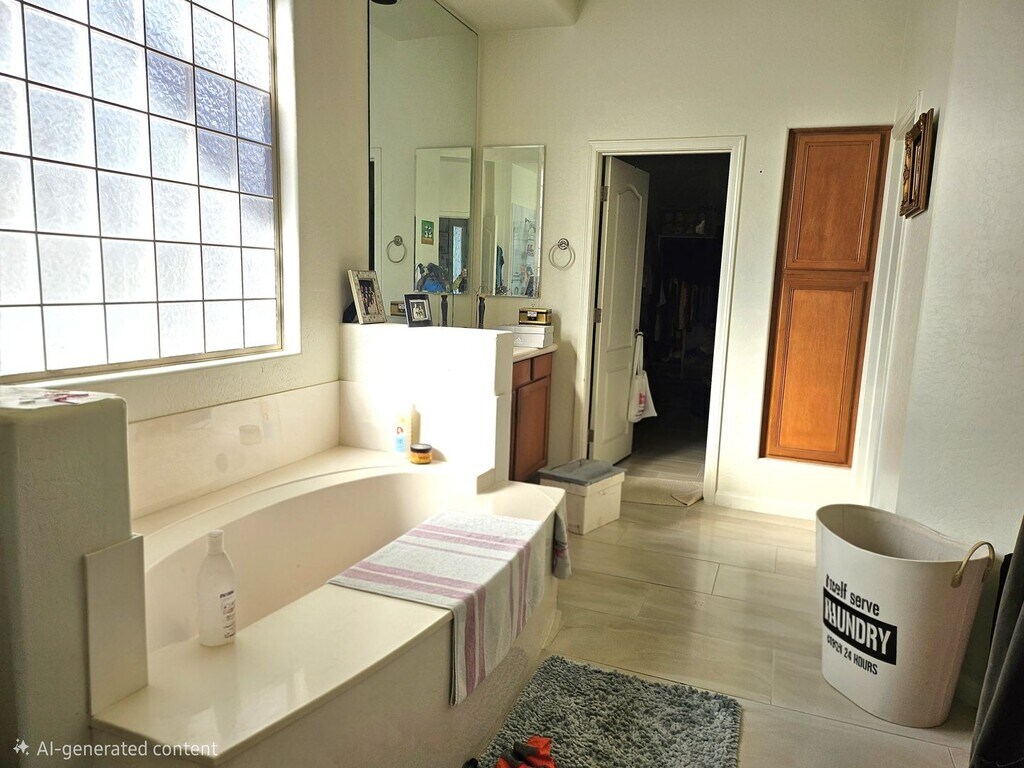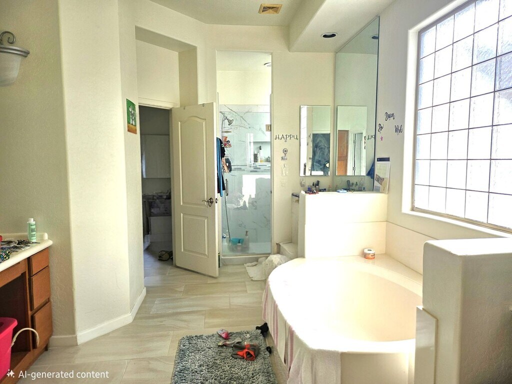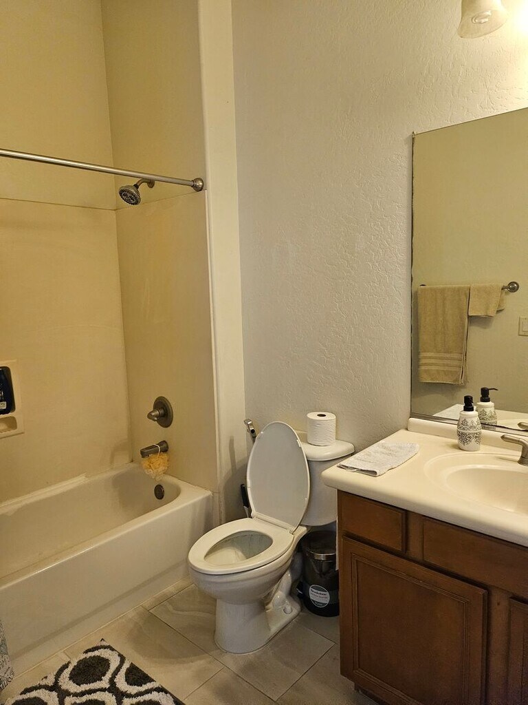 Beautiful large 5 bed 3.5 bath home in the Paseo Trail community. All tile throughout with clean crisp light neutral colors. Big open kitchen concept with staggered cabinets, SS appliances and island. Master bedroom with en-suite that has large soaking tub and separate shower, walk in closet and private toilet room. 2nd bedroom with en-suite as well as 3 other guest bedrooms and half bath. Community has a children's playground and walking path.