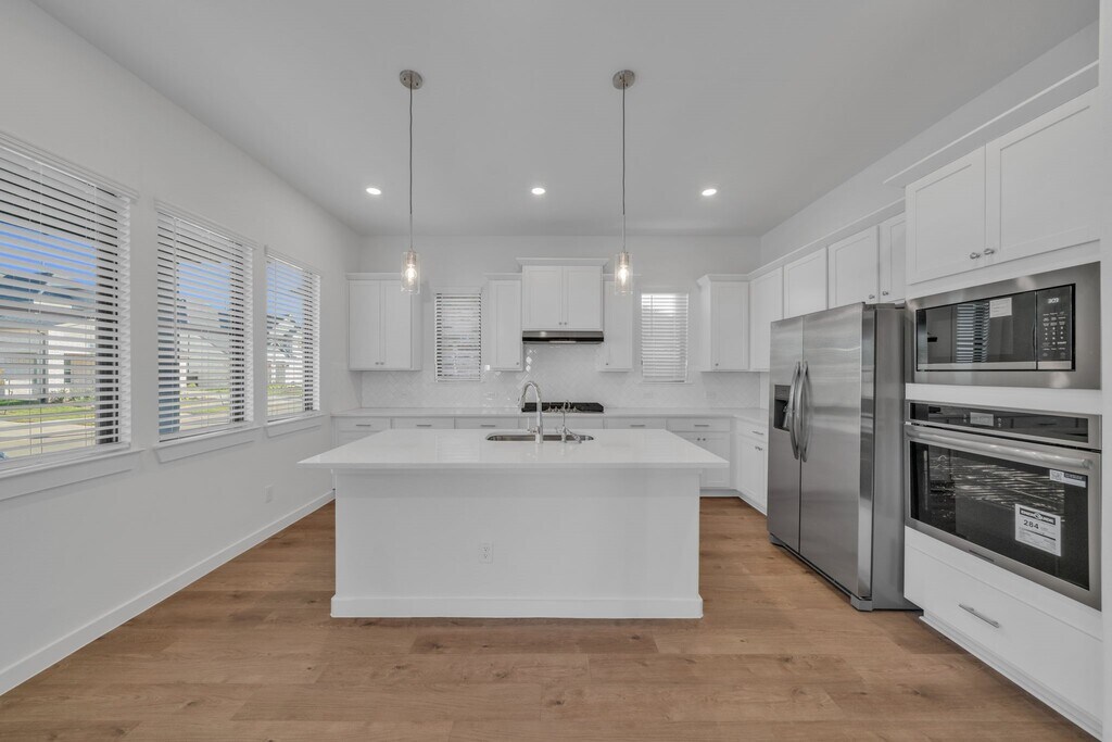 BRAND NEW,NEVER LIVED IN! Modern 2-story home featuring 4 bedrooms (primary + one bedroom downstairs),3 full baths,and one Powder Room,game room,and 2-car garage. Open-concept kitchen with white quartz countertops and stainless steel appliances. Enjoy a covered front porch and spacious covered back patio overlooking a landscaped backyard. Upgrades include vinyl plank flooring,recessed lighting,cordless blinds,ceiling fans,and sprinkler system. Located in a master-planned community with a town center,dog park,farm & pasture,lake,and trails. Minutes from Grand Parkway 99,Highway 90,Costco,H-E-B,and Target. Move-in ready with Refrigerator,Washer & Dryer included. MLS# 6589539