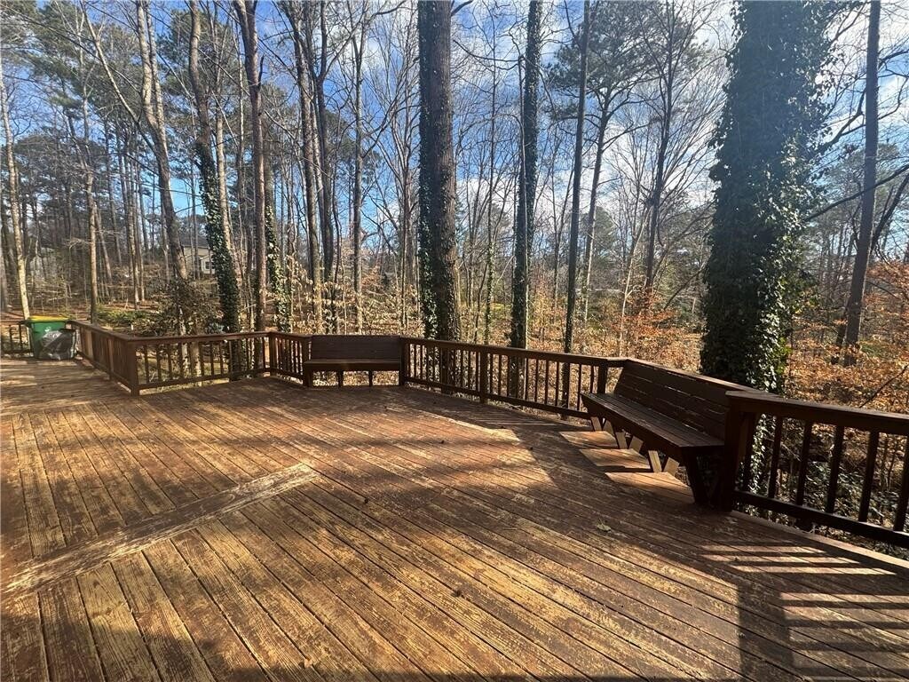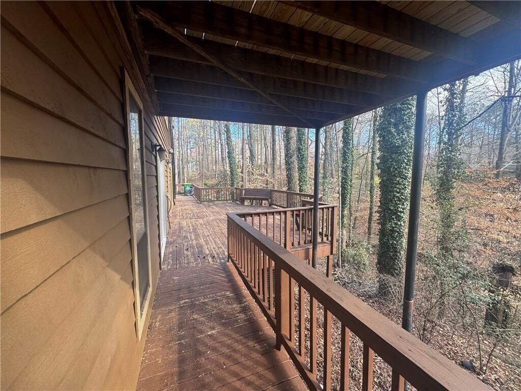Welcome to this tree house style four bedroom two bath single family home in Holly Springs Crossing. Fantastic neighborhood in the Pope school district. Three level layout with the primary bedroom on the main level and a full walk out basement plus den. The kitchen features stone countertops a breakfast bar and stainless steel appliances. The living room offers vaulted ceilings,exposed beams,skylights and a stone fireplace. Hardwood flooring throughout. Two car side entry garage and a massive deck overlooking a wooded lot. Convenient East Cobb location in the Murdock Dodgen and Pope school districts close to shopping dining and major routes. Unfurnished. Tenant pays all utilities. MLS ID 7709286