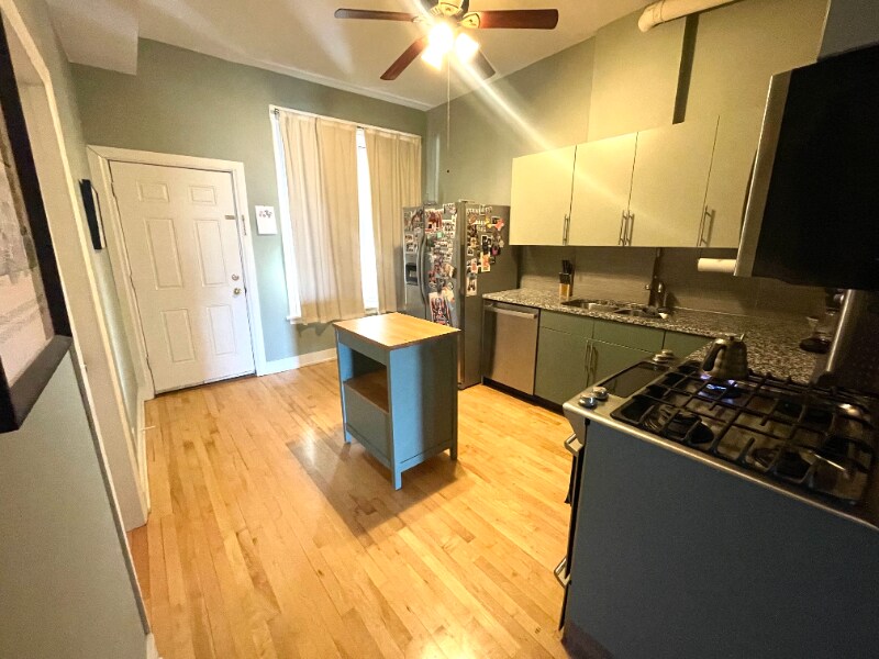Property Id: 2296203 Move in to this beautiful, sunlit three bedroom apartment and make Humboldt Park your new home! Just steps away from Humboldt Park (yes, the actual park itself!), you can take full advantage of this gorgeous residential neighborhood. The park is a mere two minute walk away, where you'll find a swimming pond, beach, rec center, soccer goals, Little Cubs Field, a playground, and a Bird & Butterfly sanctuary--and that's just on one side of the park! On the other side of the park you'll find a large lagoon, tennis courts, and local businesses like Spinning J cafe and Rootstock wine bar. The street is very quiet and safe. Across the street you'll find an elementary school and a community garden just behind it. If you walk a little further north about 15 minutes, you'll find Chicago's 606 Trail. The apartment is on the top floor of a three-story greystone building, so you won't hear any noise coming from upstairs! There are two bedrooms in the rear of the apartment, and one towards the front that gets great light. A couple highlight features of the apartment includes high ceilings, bay windows (in the front and on the side!), in-unit laundry, a near new dishwasher, a separate dining room, and hardwood floors. There is also a storage area in the enclosed back stairwell. Photos are from the previous resident. The bedroom walls are all a neutral beige, but the living room is still a gold-yellow. Must be able to prove total income 3x rent and pass credit and background checks.