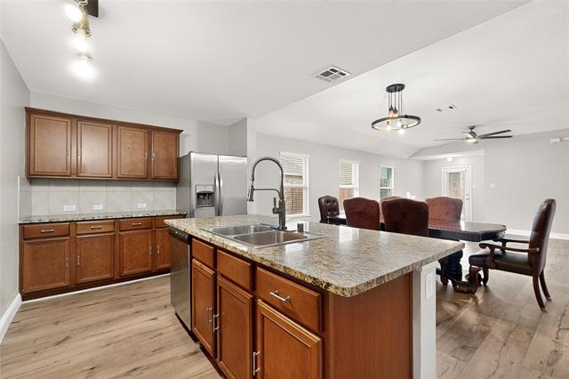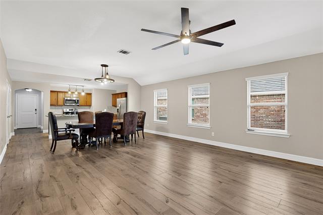 Welcome home, which offers an excellent opportunity for comfortable living and entertaining. The kitchen is a chef's dream, featuring a large island with bar seating, plenty of cabinet space, and abundant counter space. The primary bedroom serves as a true retreat, with a spacious layout and an ensuite bathroom equipped with a walk-in shower, a built-in vanity, and a generous walk-in closet. Step outside to enjoy the covered patio in your private backyard. Situated on a greenbelt lot, the property provides extra space for outdoor activities and gardening. Located within the Forney Independent School District, this home is conveniently close to Downtown Forney, which offers a variety of local shopping and dining options. Enjoy the lake, swimming pool, and walking trail the community offers. The refrigerator will remain in the home, and the dining table can be included if desired by the tenant. Other appliances included are the washer and dryer, microwave, stove, and dishwasher.