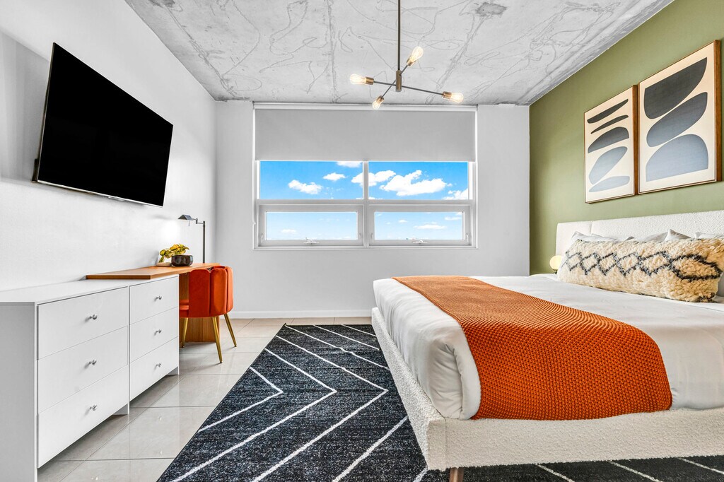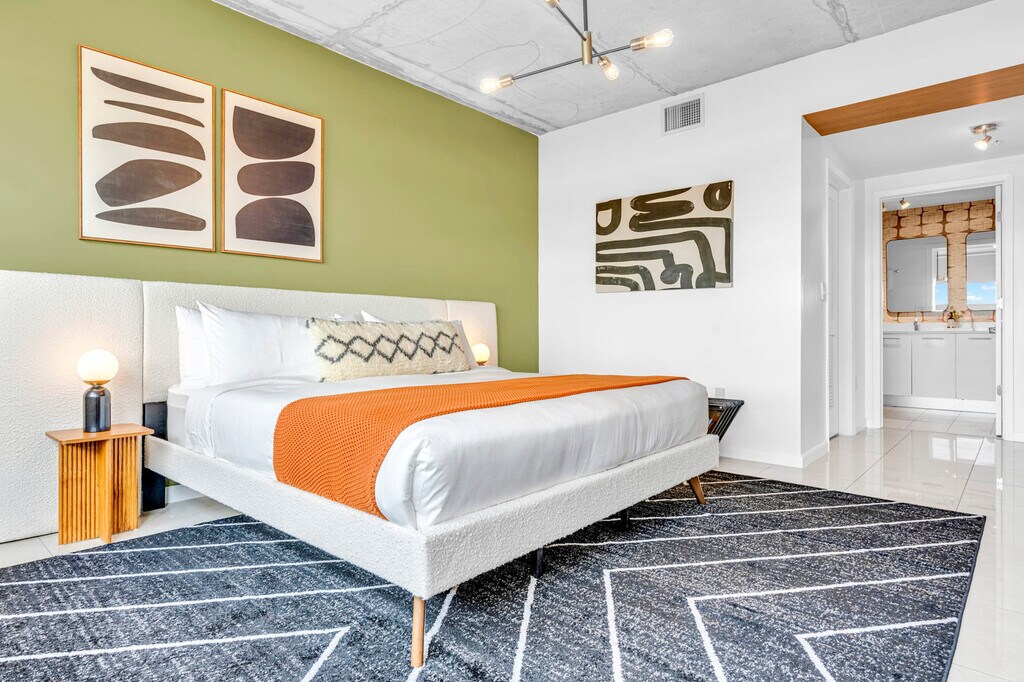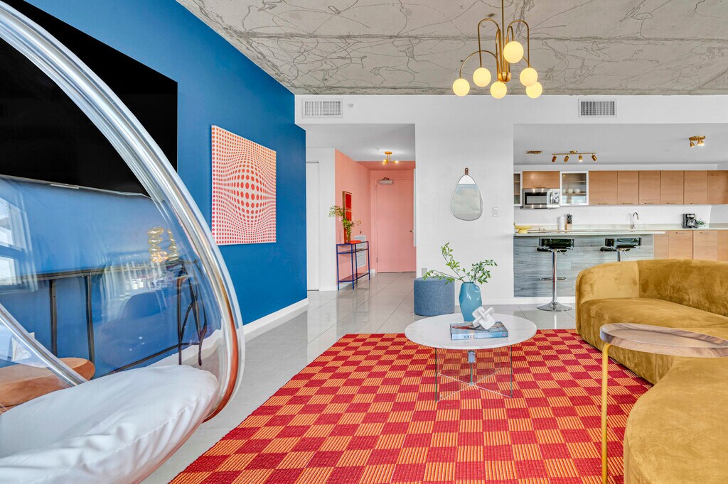 Feel the city's energy in this one-of-a-kind corner apartment in the heart of Miami. This unique space offers a blend of relaxation and inspiration, adorned with stunning contemporary designs and resort-style amenities, including a fitness center, pool with cabanas, and an outdoor dining area with a summer kitchen and BBQs. The apartment features a serene primary bedroom with a king-size bed, en-suite bathroom, ample closet space, and a Smart TV. The second bedroom includes two full-size beds and ample closet space. The stylish living room offers a comfortable sofa, a dining table for four, and a Smart TV. The modern bathroom is equipped with a walk-in shower, and the fully equipped kitchen includes a coffee machine and various cookware. Covered garage parking is available with a clearance of 6’8", and EV charging is provided. Pets are welcome with a $150 fee per pet, with weight and size restrictions. Concierge services are available for booking boats, chefs, massages, and more, provided by local third parties. Housekeeping can be arranged during your stay at your cost. Fines may be assessed for excessive cleaning, trash removal, and property damage. Located in the vibrant heart of Miami, this apartment is within walking distance to Wynwood and The Design District. Enjoy easy access to iconic locations such as the Wynwood Arts District (approximately 1 mile), Miami Design District (roughly 1.3 miles), Miami Beach (just 5.5 miles away), and Brickell City Centre (around 2.7 miles). Experience a blend of art, culture, and beachside relaxation. There is an ongoing restoration project on some of the unit balconies, with noise occurring between 9 AM and 4 PM, Monday to Friday. Check-in is after 4 PM with self check-in at the front desk, and check-out is before 11 AM. Early or late check-in/out may be available upon request. A one-time registration fee of $50 per guest or family member is required at check-in. A strict no-smoking policy is enforced, with a $100 cleaning fee for any smoke smell. Quiet hours are observed after 10 PM, and parties or large gatherings are prohibited. Violations may result in a $50 fee per person and potential termination of stay without refund. All guests must be 21 years or older unless accompanied by a parent or pre-approved. Security cameras are installed outside for protection. The apartment includes essentials like Wi-Fi, Smart TVs, an ironing set, laundry facilities, a portable crib, toiletries, linens, and towels. Note that washcloths and kitchen towels are not included. [SI]