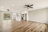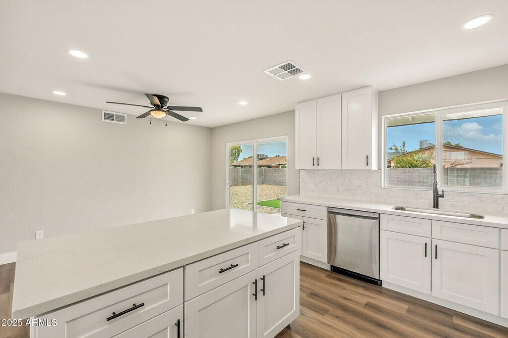 Modern updates meet effortless living. Amazing yard and shed. This beautifully remodeled 2-bedroom,2-bath home has been transformed inside and out with no detail overlooked. Step inside to find a bright,open floor plan with soaring new finishes including fresh interior & exterior paint,re-textured ceilings,and luxury vinyl plank flooring throughout. The kitchen is a showstopper,complete with new white shaker cabinets,quartz counters,stylish backsplash,island,and brand-new stainless steel appliances (dishwasher,range,and microwave). The kitchen and family room were opened up to create an airy flow expanding the living area,and making it perfect for entertaining. Both bathrooms have been fully upgraded. The guest bath features a new tub with tile surround with modern lighting. In the primary suite bathroom you'll notice a custom tile walk-in shower. Make sure to also take a look at the large walk in closet after admiring the bathroom. Every detail was paid attention to for style and functionality. From a brand new roof to new baseboards,doors,dual-pane energy efficient windows,fans,lighting,and fixtures. Outside,enjoy a zero-maintenance landscaped yard with artificial turf and decorative rock ideal for relaxing without the upkeep. Plenty of yard space and a large shed for all your storage needs. This home is turnkey and move-in ready in a location that is close to everything and very desireable.