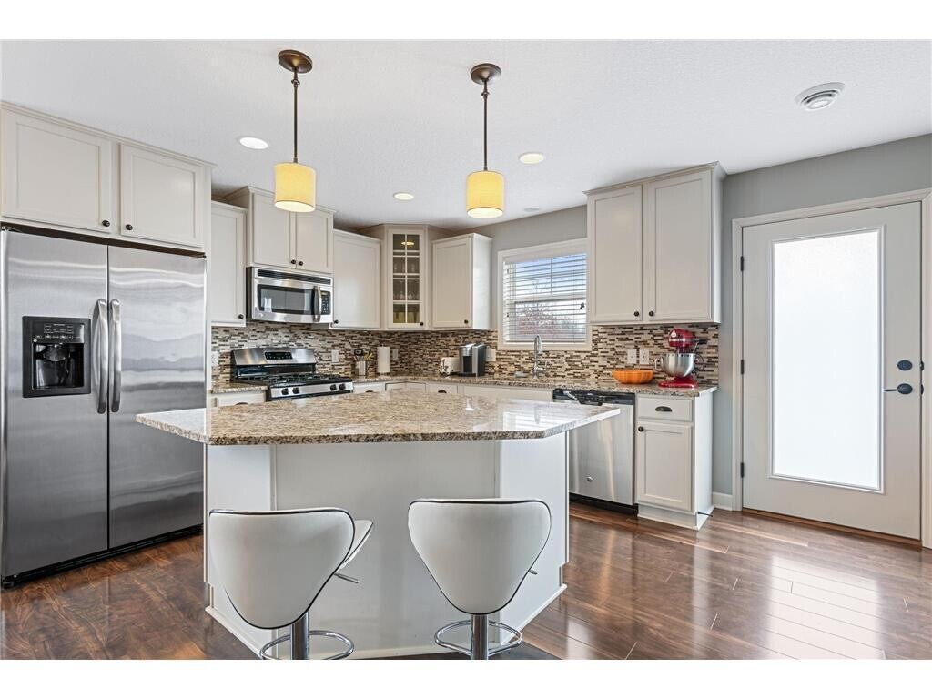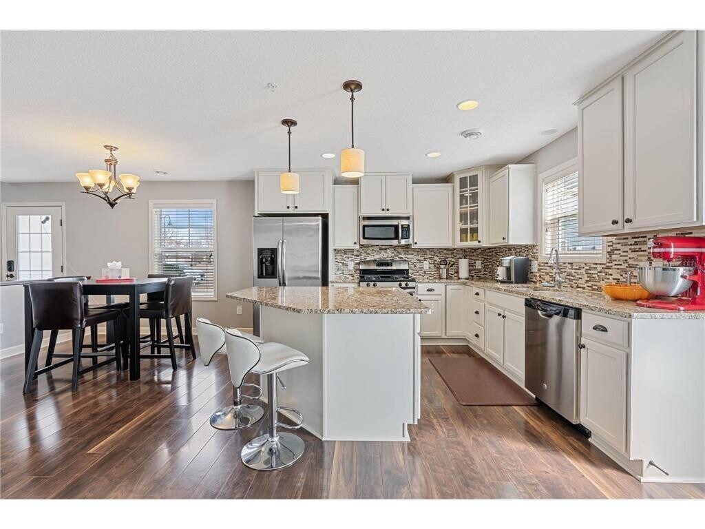 This bright and spacious END unit home offers amazing pond views and privacy. The main floor features an open floor plan, plenty of natural light, large kitchen w/stainless steel appliances, generous cabinet space, granite countertops, family room with the fireplace, and dining area. Upper level features large owners suite with walk- in closet and private bathroom, two additional bedrooms, full bathroom, spacious loft, and laundry room. Enjoy a quiet, safe neighborhood with walking access to a nearby playground, plus a park offering winter sledding, baseball fields, tennis, pickleball, basketball courts, a swimming pool, and scenic walking and biking trails. Highly desired Wayzata school district.