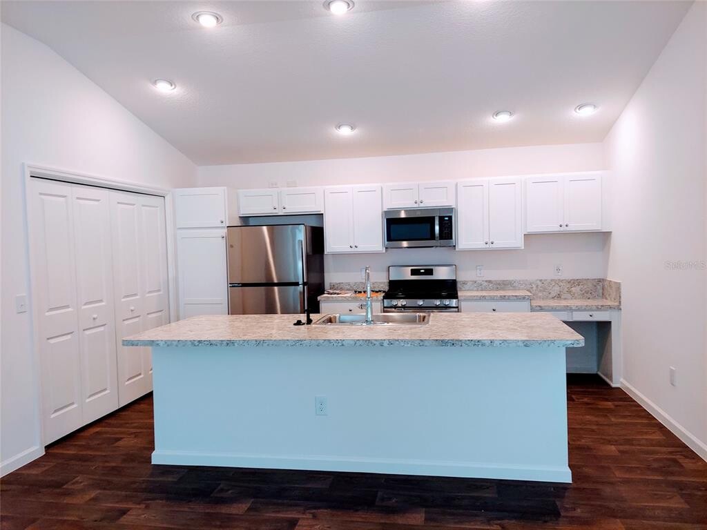 Tina Teraskiewicz, PAVillage of Deluna! New LVP floors throughout. Perfect Emerald Patio Villa with one car garage and separate golf cart garage. Screened front lanai with ceiling fan is ideal for outdoor dining and relaxing. Open living area provides great flow through the living, dining and kitchen areas! Island kitchen has plenty of storage, built in desk, stainless appliances and inside laundry. Primary suite includes large bedroom and ensuite bath with walk in shower, double sinks and linen closet. Guest room has wall closet and is adjacent to guest bath with tub/shower combo. White cabinetry in kitchen and both bathrooms keep everything light and bright! Available April 2026.