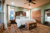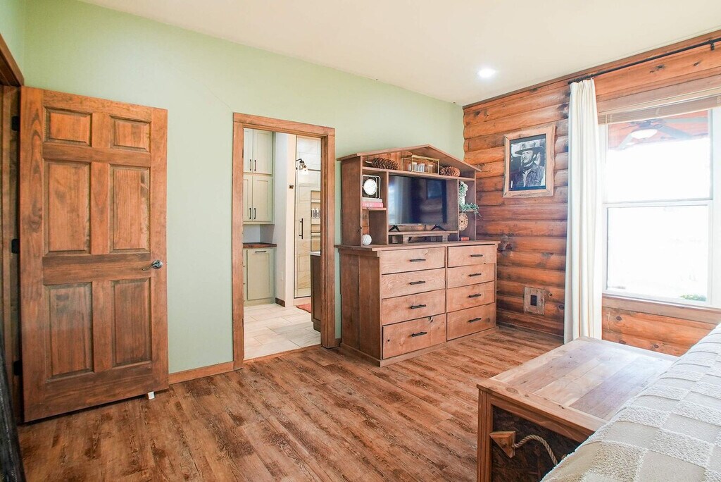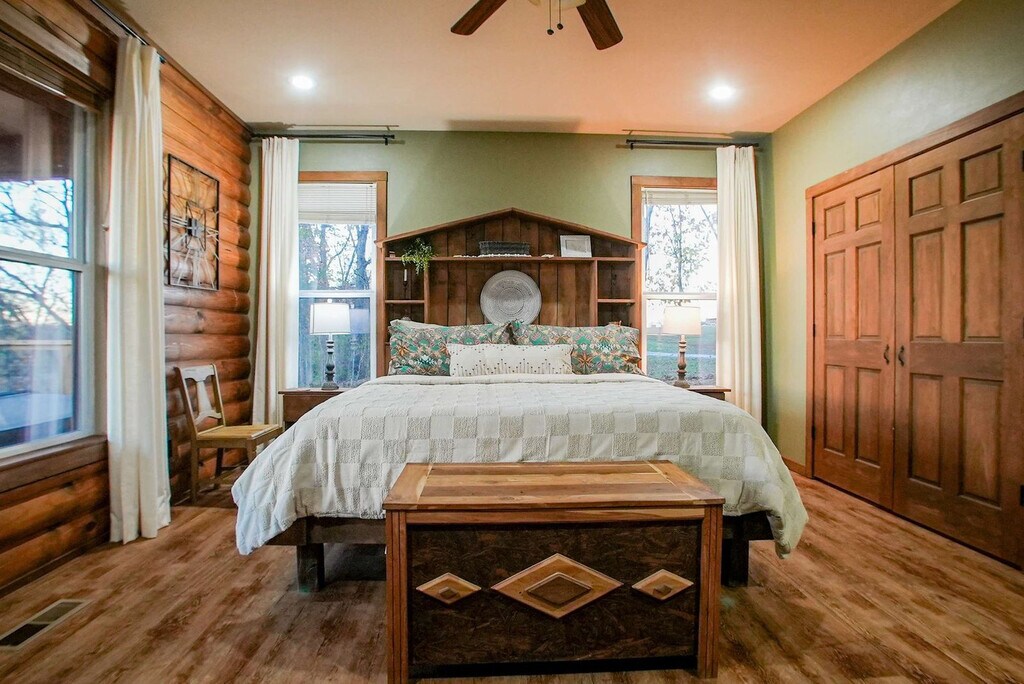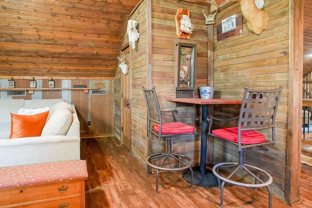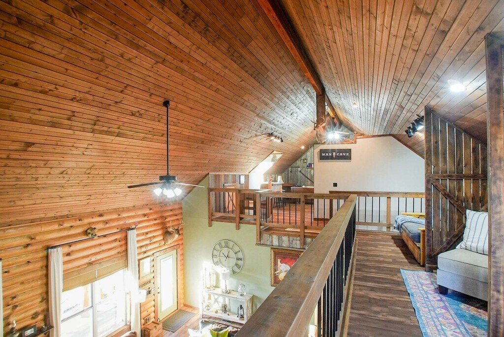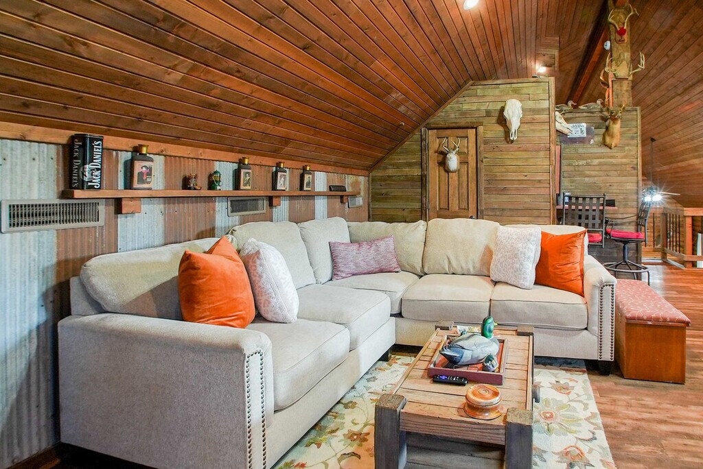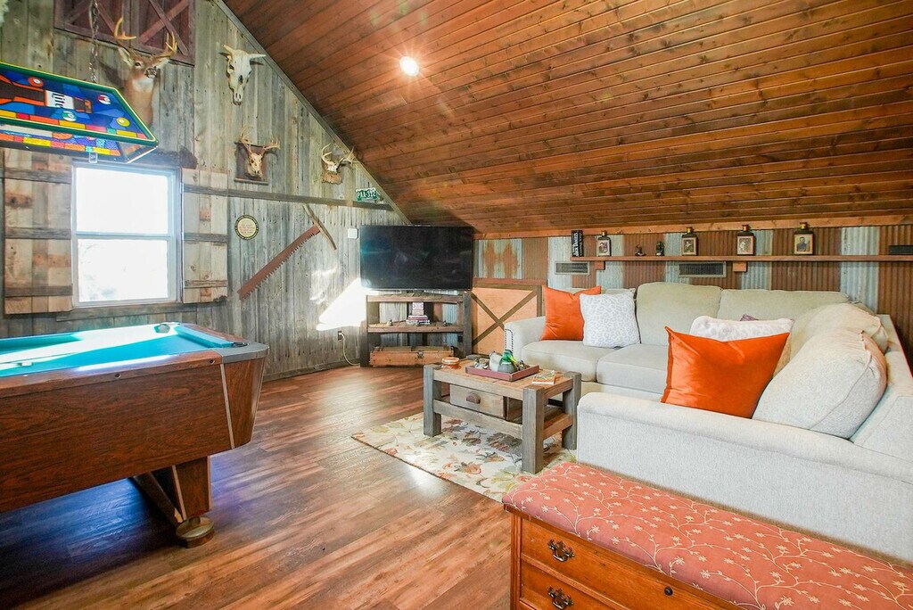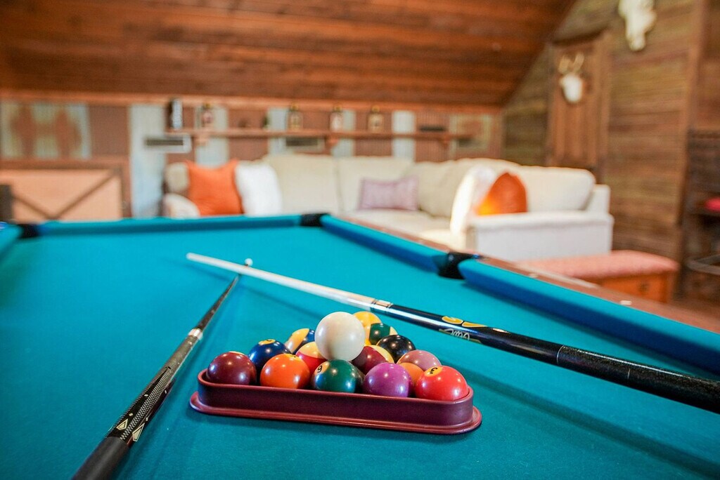Feel at home in Hilltop Haven, a 2-bedroom plus loft cabin nestled on a peaceful hilltop. This retreat blends rustic charm with modern comforts and offers endless entertainment indoors and out. This cabin features vaulted ceilings, warm wood accents, a stone fireplace, a spacious living room and dining area, and a fully equipped kitchen with modern appliances and an island. Enjoy the wraparound deck with a dining area and seating, a fire pit, a propane grill, and panoramic views. For entertainment, there is a game loft with foosball and pool tables, a smart TV, a lounge area, high-speed Wi-Fi, and streaming apps. Some wall decor have the appearance of antique firearms, but they are not actual firearms, nor do they function as such. Up to 2 well-behaved dogs are welcome, but no cats are allowed due to allergies. Please bring your own pet supplies and crate dogs when left alone. Nestled in a tranquil and secluded area just 15 minutes from Fayetteville, this hilltop retreat offers the perfect blend of privacy and convenience. Surrounded by rolling hills and scenic countryside, it’s a peaceful escape from everyday life. It's also located 15 minutes from the University of Arkansas and Downtown Fayetteville for restaurants, shops, and cultural attractions. Explore hiking and biking trails, Crystal Bridges Museum, and the natural beauty of the Ozarks. Quiet hours are from 9 pm to 8 am; please respect neighbors and the tranquil rural setting. Smoking and vaping are only allowed outside, and cigarette butts must be properly disposed of. The pool is seasonal, open April through September, and the hot tub is available year-round. Use at your own risk and supervise children. Please shower before use. Exterior cameras monitor the driveway and deck for safety; there are no cameras inside. Multiple steps and uneven terrain may not suit guests with mobility limitations. Expect wildlife, insects, and rural road noise. Parties or events are not permitted without prior approval. [SI]