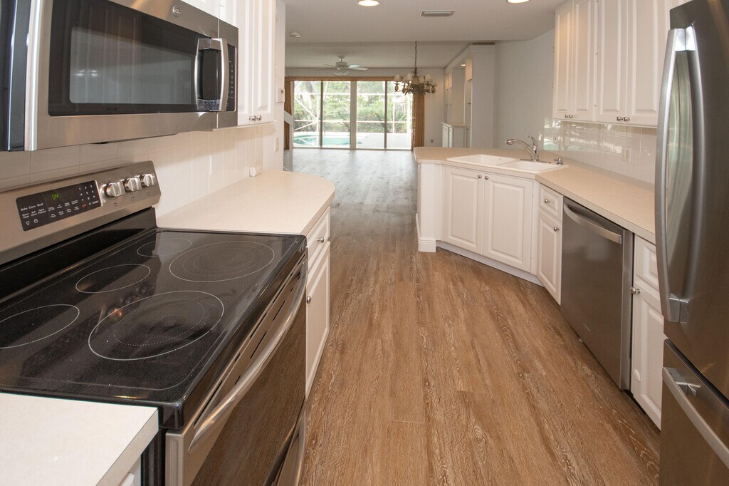Hands down the nicest rental in the area! 3 bed/2.5 BA/1 car gar W/2 car-Brick-Paved parking pad. PRIVATE POOL(owner pays weeky maint)W/screened enclosure & pool deck.3rd BR can b den or office. Nice open views from every window. Freshly painted throughout. Plantation Shutters on all windows & lovely custom window treatments on sliding glass doors, retractable awning W/remote, no popcorn ceilings, custom flooring throughout & no carpet anywhere. Nice Laundry room W/full size W & D & loads of extra cabinet storage. Breakfast bar off open kitchen. DR, LR offers a custom wall unit that will house a 70'' TV, half bath on main level. Well appointed Primary Retreat W/dual sinks, separate shower & soaking tub, large linen closet, huge WI closet, Sep Double Closet & so much more. Don't Walk-Run!