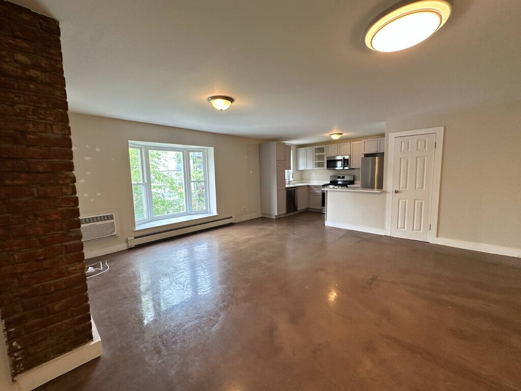 A spacious second-floor two-bedroom, two-bath in the heart of Red Hook, set directly above Red Hook Tavern at 327 Van Brunt Street. The unit runs the full second floor of a three-story multi-family building, with polished concrete floors throughout, a Juliette balcony that pulls light and street life into the second bedroom, and the kind of square footage that's increasingly hard to find in the neighborhood. The kitchen is outfitted with a dishwasher and a generous pantry is attached making it functional for people who cook. Both bedrooms are sized to fit a queen or king with room to spare, and each has a closet. Two full bathrooms means people aren't negotiating mornings, and the in-unit washer and dryer takes the laundromat run off the to do list. The Red Hook Tavern situation is worth naming directly: the unit sits above the restaurant, and Tavern's backyard garden is part of the building's footprint. For some people that's a deal-breaker; for others, it's the deal maker - having one of Brooklyn's best burgers and a serious wine list as your downstairs neighbor. The block itself puts you in the mix of everything that makes Red Hook, Red Hook: Red Hook Lobster Pound, Steve's Key Lime Pie nearby, the waterfront and Valentino Pier accessible, and let's not forget Hometown BBQ, Sunny's, Brooklyn Crab. The B61 and B57 buses run nearby, and the ferry connects to DUMBO and lower Manhattan in about fifteen minutes. Pets considered on approval. Tenant pays their own heat and electric.