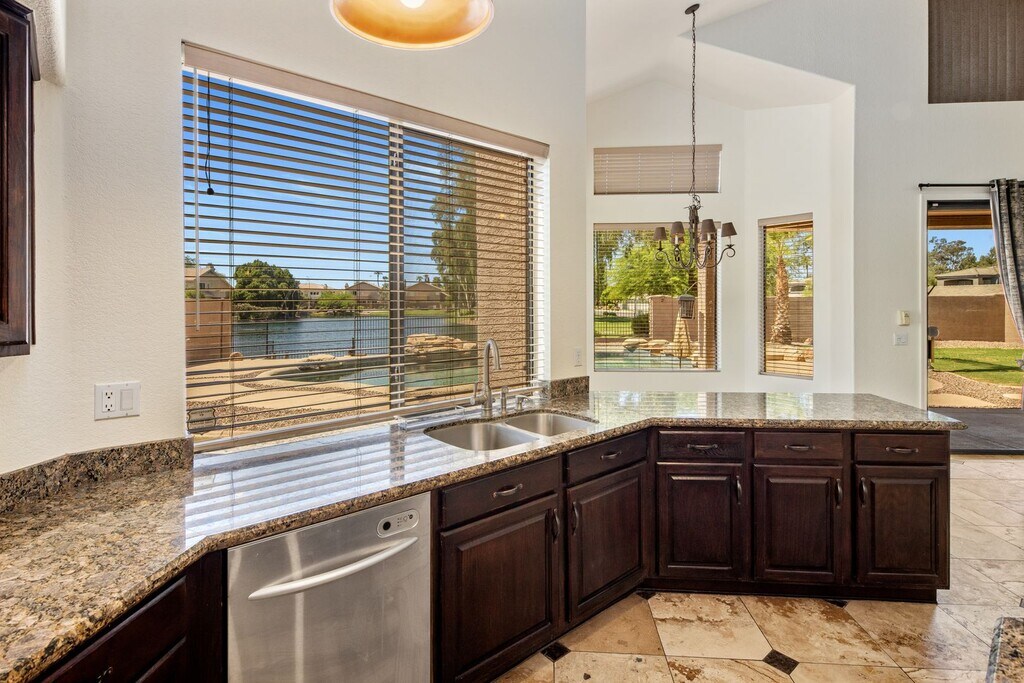 Executive level, private home in a large cul-de-sac on the lake! Freshly painted, newer carpet, Ocotillo East!! Stone accent walls in dining room and family room. Large gourmet kitchen with gas cooking, granite counters, and hanging accent lighting is open to family room with fireplace. Master bedroom is downstairs, bonus room and secondary bedrooms upstairs. This home is on a large cul-de-sac lot with expansive views of the lake from pool, patio and upstairs walk out deck. Backyard features, pool, spa, grassy area and large side yard with spectacular view of the lake. New HVAC system 2024. New spa heater and landscaping upgrades 2025. **RENTER/REALTOR TO VERIFY EVERYTHING IN THE LISTING IS CORRECT INCLUDING BUT NOT LIMITED TO APPLIANCES* If pets are approved there will be an additional fee of $25 per pet per month and $150 Pet deposit per pet. An additional 2% Admin fee will apply along with a one time $150 non-refundable lease fee.**