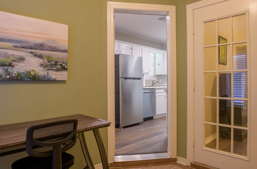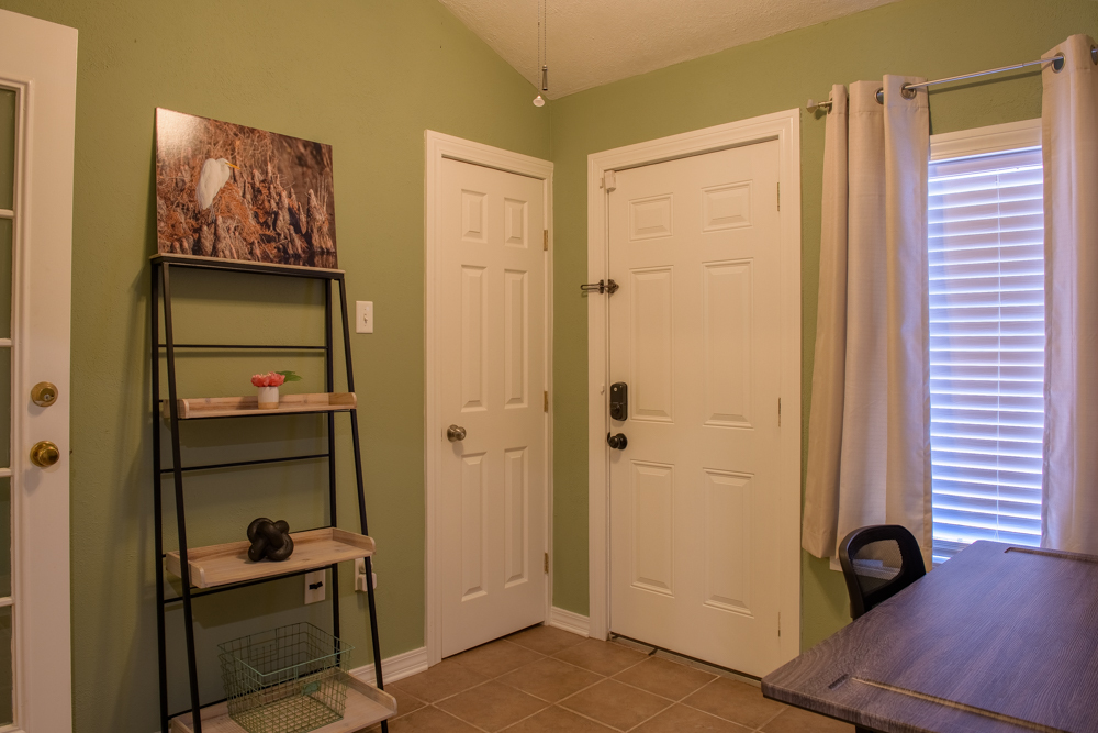 Quietly nestled among the other townhome units within the gated complex, our 1BR townhome is handsomely furnished to make your stay complete. Entering into the townhome you immediately have a coat closet to hang your outerwear. Adjacent to the entry you find the living room followed by the breakfast area and kitchen. Just off the breakfast area and kitchen will be the bathroom, bedroom with full wall-in closet, followed by the home office space, each furnished and ready for our tenants stay.