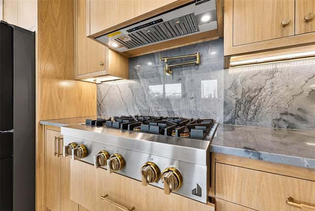 Stunning never-lived-in modern single-family home located in the highly sought-after Richardson ISD. This beautifully designed residence showcases warm wood accents that perfectly complement the clean, contemporary aesthetic. Step inside to find expansive large-format porcelain tile flooring, designer lighting throughout, and an open-concept layout ideal for both everyday living and entertaining. The gourmet kitchen is a true showpiece, featuring quartz countertops and a full quartz backsplash, gas cooktop, built-in oven and microwave, pot filler, and abundant cabinetry for storage. The spacious primary suite offers a serene retreat, while the thoughtfully designed floor plan provides both functionality and style. A well-appointed laundry room with built-in sink adds everyday convenience. Enjoy outdoor living at its finest with a fully equipped outdoor kitchen complete with a built-in gas grill—perfect for hosting gatherings year-round. This exceptional home combines modern elegance, quality craftsmanship, and prime location—an incredible opportunity not to be missed.
