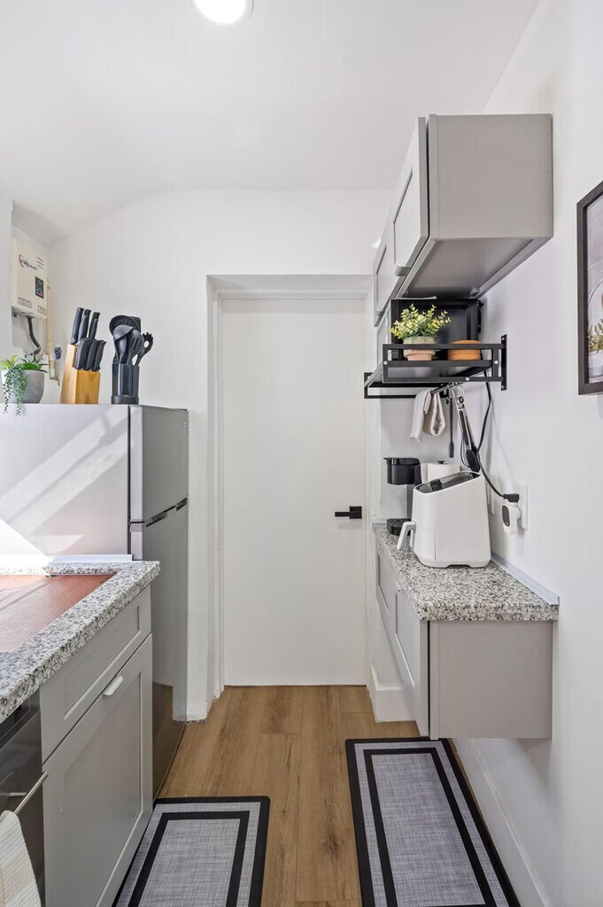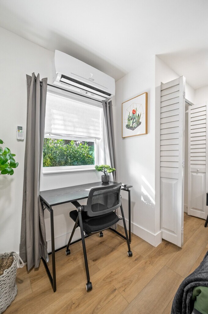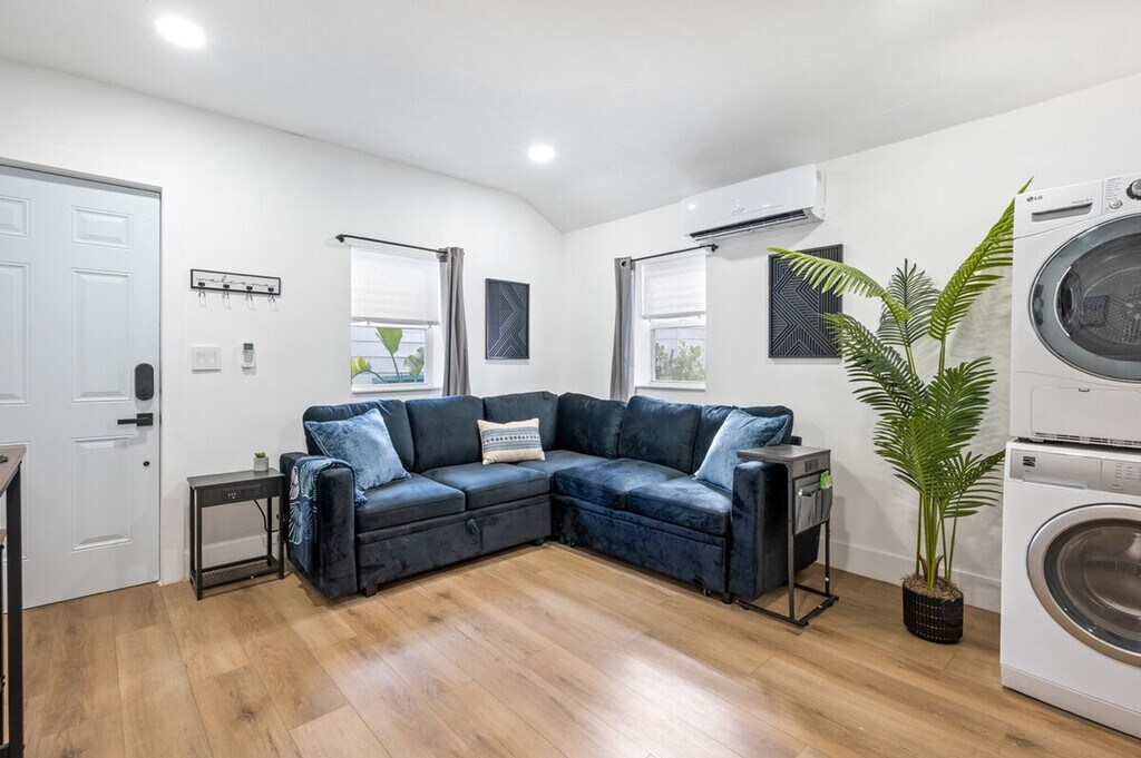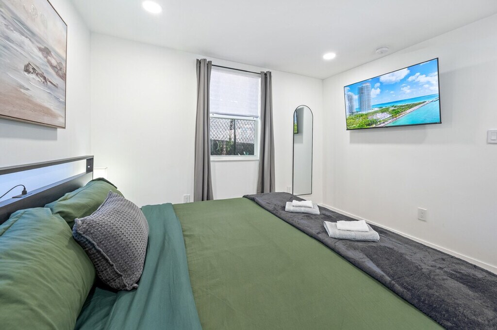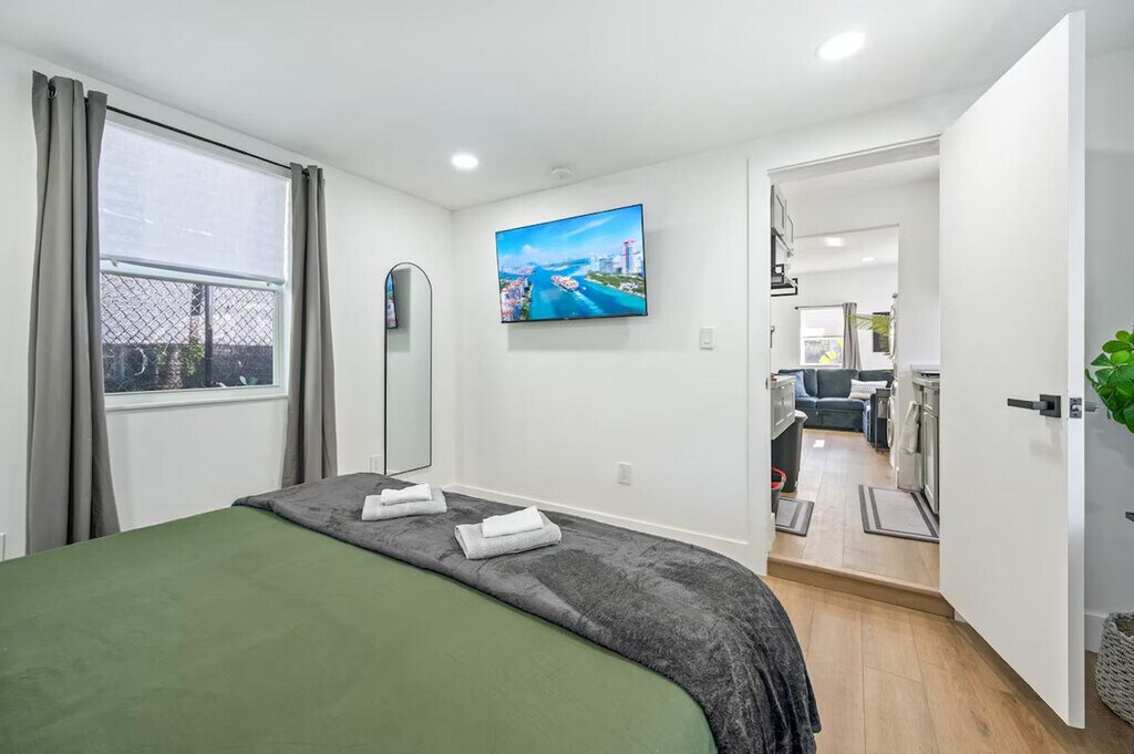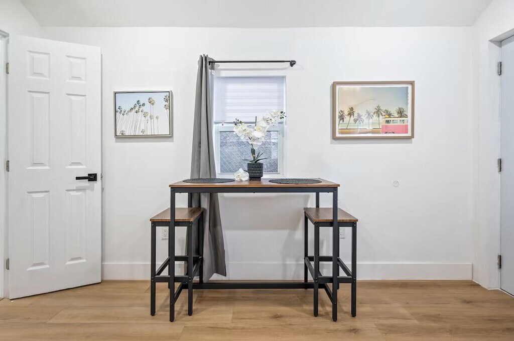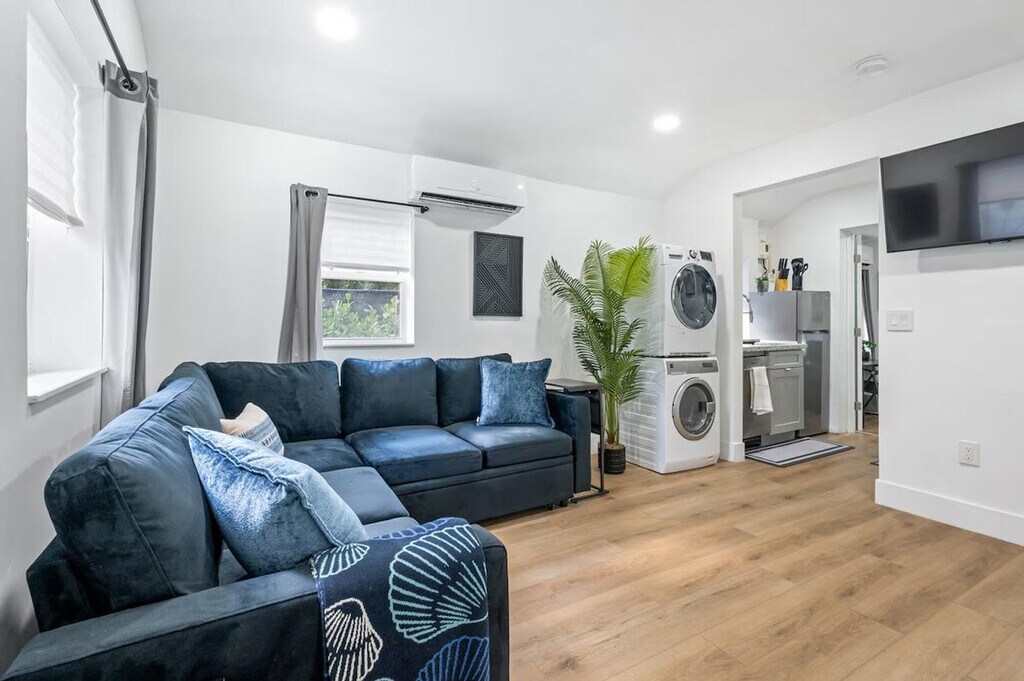Feel at home in this bright and modern 1-bedroom house north of the Design District in Miami. This property can accommodate up to 2 guests comfortably and includes gated parking. Casa Magic comes equipped with everything you will need to enjoy your time, including a fully stocked kitchen with stainless steel appliances, air fryer, washer/dryer, coffee maker and Keurig k-cup coffee maker with pods, toaster, dishes, glasses and mugs. The beautiful living room features a 55" smart TV with streaming apps and a reclining sofa. There is also a cozy dining area and a full bathroom with a luxurious rain showerhead, shampoo, soap, and towels. Interior parking is available in the driveway. This apartment is located 7 minutes from Wynwood, the Design District, and Midtown, 15 minutes from South Beach, 10 minutes from MIA airport, and 12 minutes from Brickell. Guests have complete access to the house and a private outdoor space in the backyard. The property has a principal separated house that is a mid-term rental but it's separate and private from this main house. Your rental is 100% private with its own private entrance and private backyard space! Check-in and check-out are made easy with smart, keyless entry. There is a security camera system on the exterior of the home for additional peace of mind during your stay.