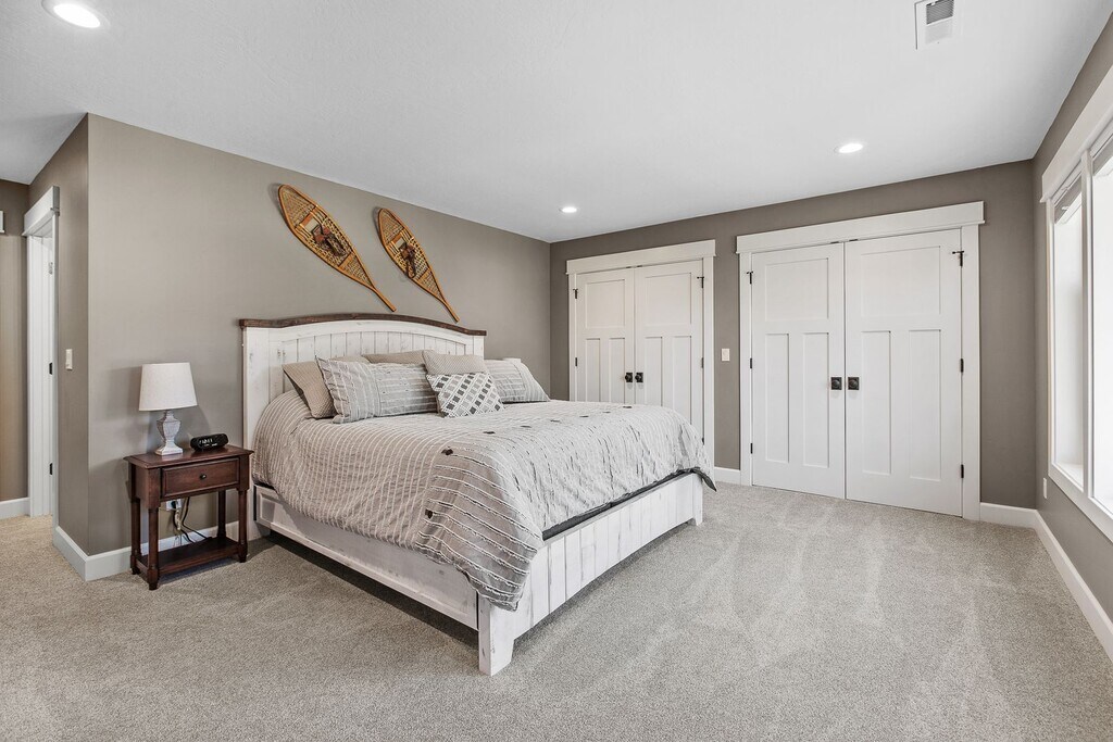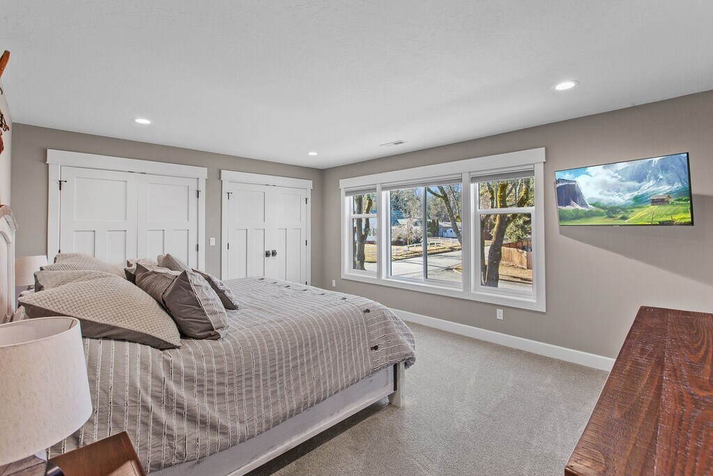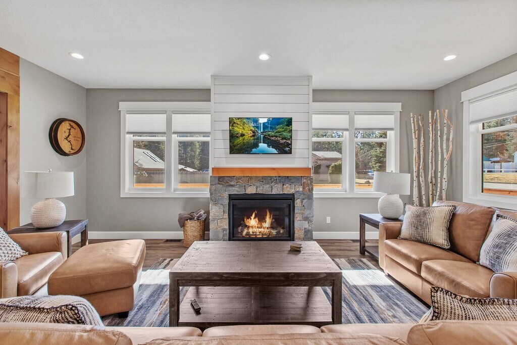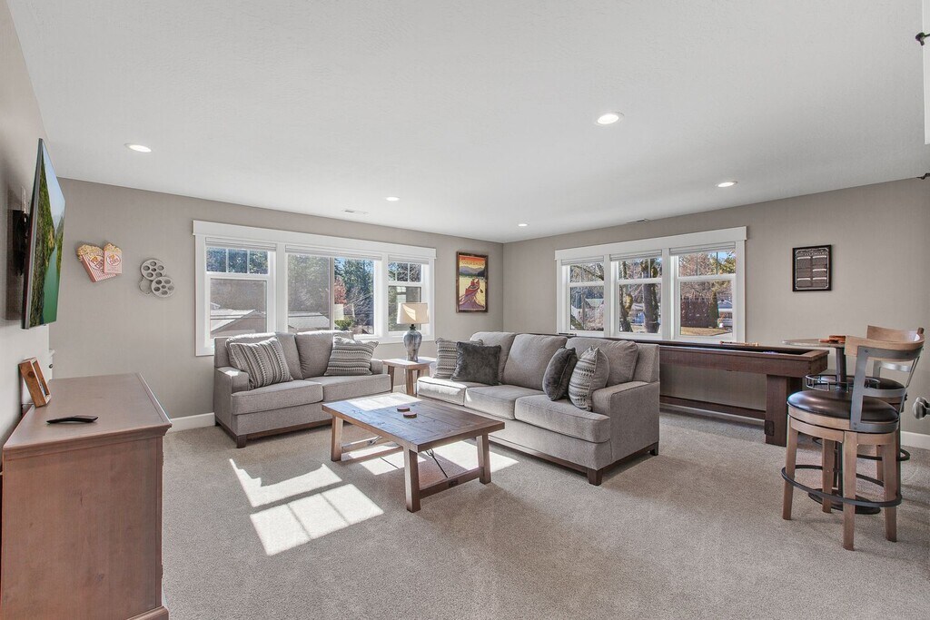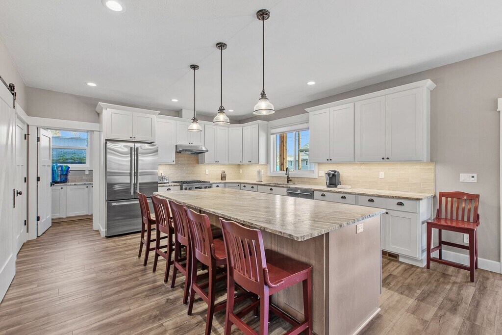 We just finished construction on this home in 2024. Tucked away in the Sanders Beach area of Coeur d'Alene, it provides a great location to enjoy downtown amenities while soaking in nature. The home is 2,986 square feet with 4 bedrooms and 3.5 bathrooms and comes fully stocked with all of the utilities included. There are three bedrooms have King sized beds while one room has two sets of bunkbeds that also have trendle beds underneath. The downstairs den can sit a large group while also close enough to the dining room and kitchen to enjoy conversations. The upstairs living room is a perfect get away from the rest of the house to enjoy games, TV or enjoy a full-sized shuffleboard. Enjoy the porch that wraps around 3/4 of the house. In-between the porch and the garage, you can find our firepit with easy controls to use. The firepit area and the driveway are heated so rest assure you will have a melted area to use as well as the garage itself. Our goal is to make you surprised on how well the kitchen is stocked for any occasion. The location is close to Sander's Beach, Tubbs Hill, downtown and the park. There are a couple bikes if you wish to make a longer venture down the old highway to eagle watch.