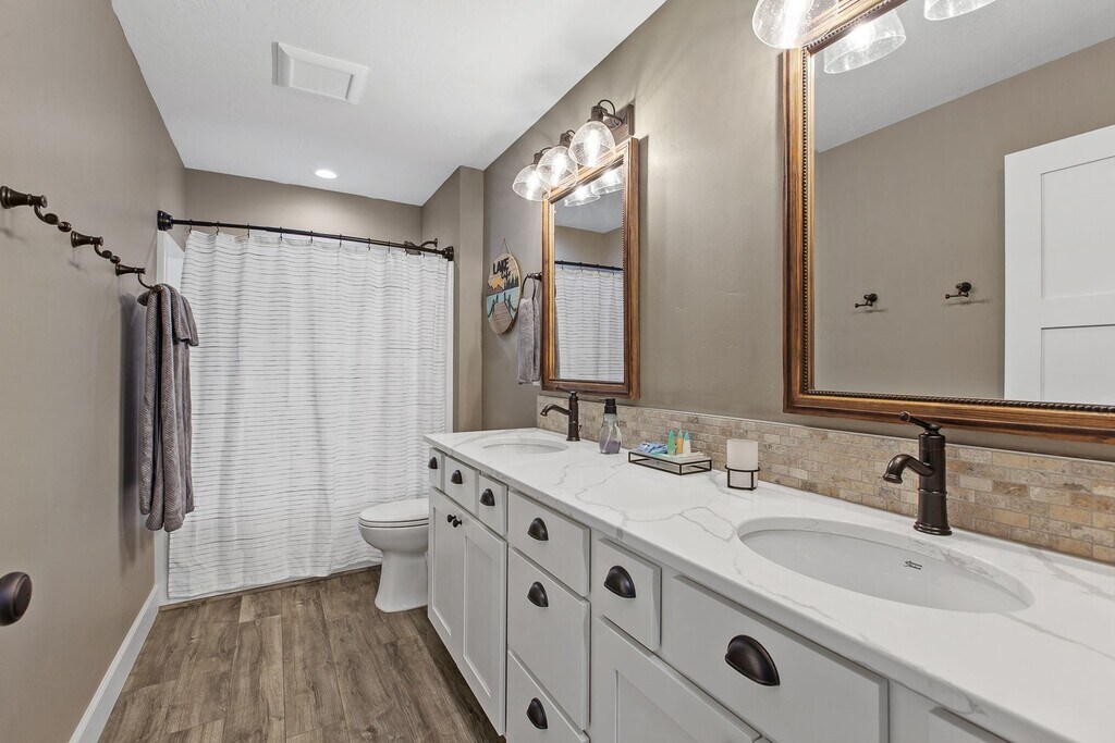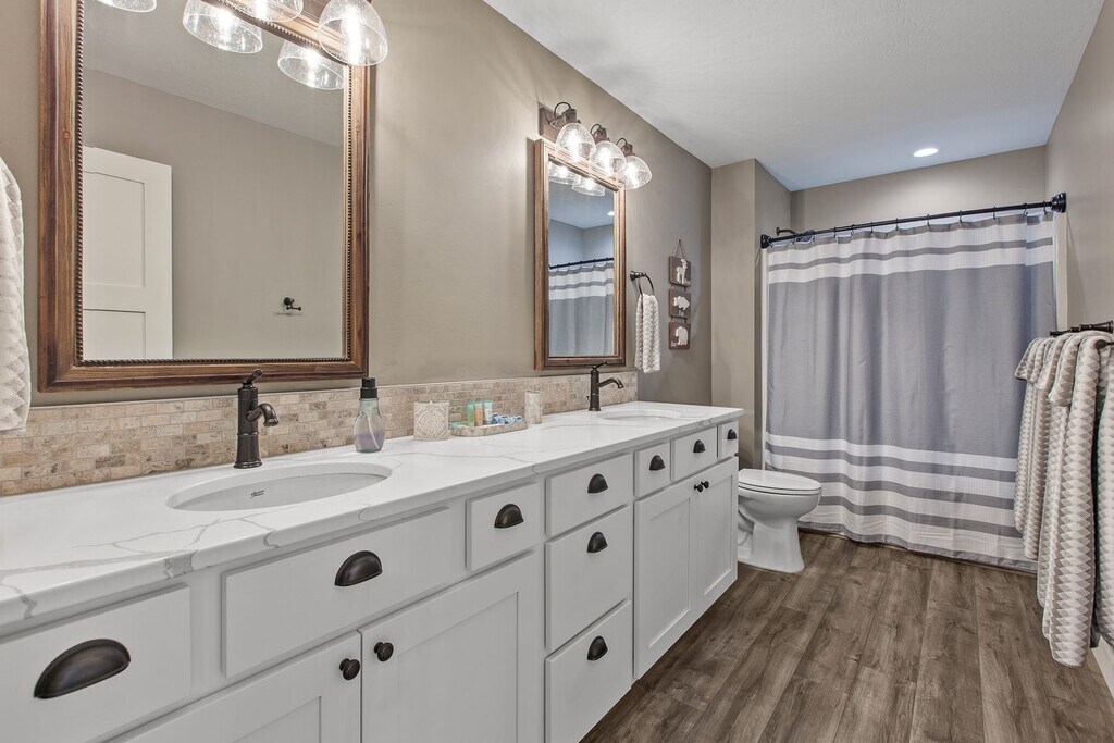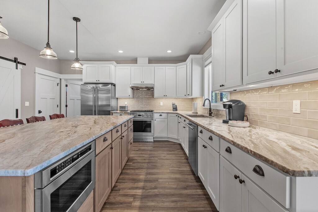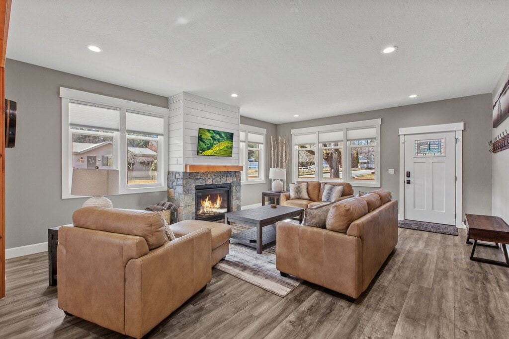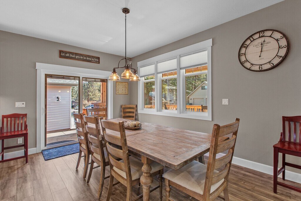 We just finished construction on this home in 2024. Tucked away in the Sanders Beach area of Coeur d'Alene, it provides a great location to enjoy downtown amenities while soaking in nature. The home is 2,986 square feet with 4 bedrooms and 3.5 bathrooms and comes fully stocked with all of the utilities included. There are three bedrooms have King sized beds while one room has two sets of bunkbeds that also have trendle beds underneath. The downstairs den can sit a large group while also close enough to the dining room and kitchen to enjoy conversations. The upstairs living room is a perfect get away from the rest of the house to enjoy games, TV or enjoy a full-sized shuffleboard. Enjoy the porch that wraps around 3/4 of the house. In-between the porch and the garage, you can find our firepit with easy controls to use. The firepit area and the driveway are heated so rest assure you will have a melted area to use as well as the garage itself. Our goal is to make you surprised on how well the kitchen is stocked for any occasion. The location is close to Sander's Beach, Tubbs Hill, downtown and the park. There are a couple bikes if you wish to make a longer venture down the old highway to eagle watch.