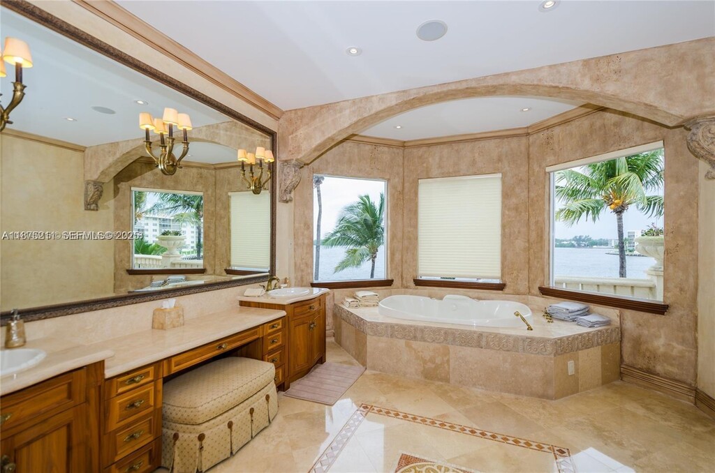Welcome to your dream waterfront retreat! This Mediterranean masterpiece sits on a rare point lot with 220 ft of sparkling waterfront and a private 80-ft dock offering direct ocean access! Perfect for yacht owners and water enthusiasts, you’ll be just minutes from Haulover Inlet. Inside, over 6,300 sq ft of luxury living awaits, featuring 5 spacious bedrooms, 5.5 baths, marble and hardwood floors, soaring ceilings, and endless natural light. The chef’s kitchen, grand living areas, and maid’s suite make it ideal for entertaining and everyday comfort. Features a heated pool & spa, expansive terraces, and breathtaking views that capture Miami living at its finest. Tucked inside the guard-gated Eastern Shores community, this estate offers the perfect blend of privacy & prestige.
