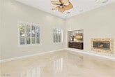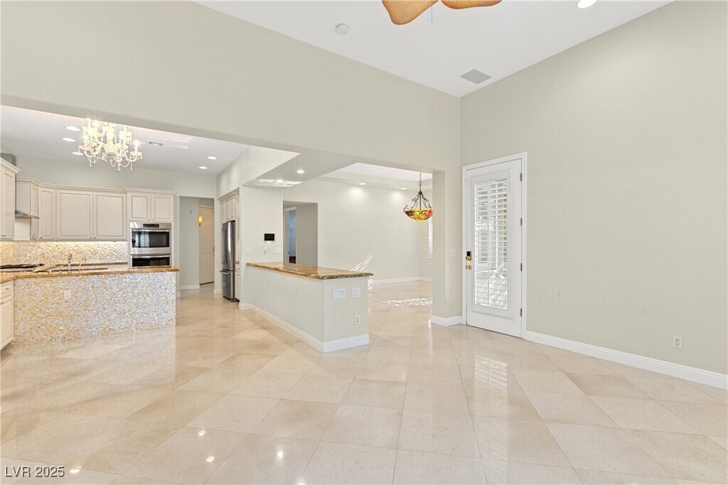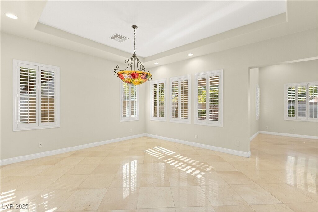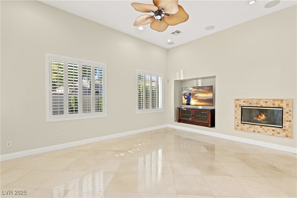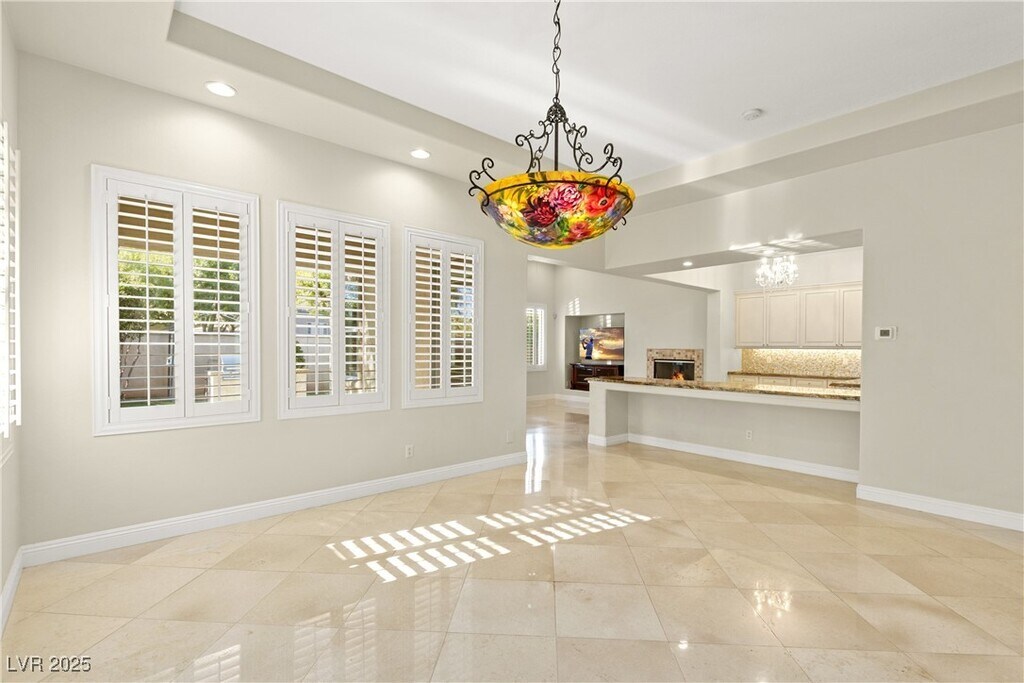 Experience luxury living in the prestigious guard-gated Red Rock Country Club with this stunning single-story home offering 3 bedrooms, 2.5 bathrooms, an office, and 3-car garage. Elegant Italian marble tile flows throughout the home, complementing vaulted ceilings, ceiling fans, surround sound, and a cozy fireplace in the family room. A formal dining room adds the perfect touch for hosting. The beautifully appointed kitchen features granite countertops, a breakfast bar and nook, double ovens, stainless steel appliances, and ample cabinetry. The separate den includes custom built-in cabinets and shelving, ideal for a home library or media space. Retreat to the luxurious primary suite featuring dual vanities, a makeup table, a freestanding soaking tub, and an oversized walk-in steam shower with built-in bench. The backyard is designed for relaxation with a covered patio, lush rear lawn, and a built-in barbecue.