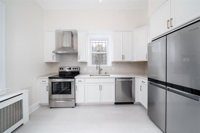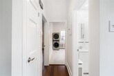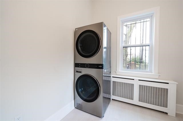 Atmosphere of a private home with separate entrance and private vestibule. Centrally located to transportation in the heart of Journal Square. Newly Renovated 1 bed plus large den boasts approx. 875 sq ft with 10.5 ft ceilings, all rooms are oversize plus brand new hardwood flooring and Solid wood doors throughout. Custom cabinets and brand new kitchen appliances, brand new in-unit washer and dryer. A/C units included. Renovated with top quality materials, 1 car parking available for extra $250 a month, heat and hot water included, this home checks all the boxes. One year lease. 1.5 month security. 1month realtor fee. NTN application required. Rental Insurance Required. No pets. No smoking.