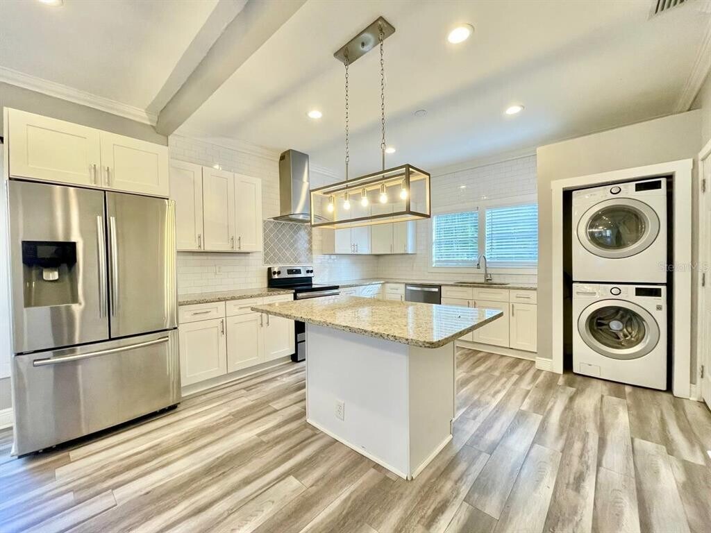 Step into the allure of a bygone era with this lovingly restored 1923 home near Ybor City on a large corner lot. Meticulously remodeled,this two-bedroom,one-bathroom residence seamlessly combines historic charm with modern conveniences. Be greeted by the inviting open wooden porch,a perfect spot to savor the Florida breeze and immerse yourself in the character of this vintage gem. Inside,discover the timeless appeal of wood laminate flooring,creating a warm and inviting atmosphere throughout the home. The updated kitchen is a culinary masterpiece,featuring stone countertops,a tiled backsplash,a large island,and stainless-steel appliances creating a perfect blend of style and functionality. Modern living meets historical authenticity with original wood-planked ceilings in both bedrooms,adding a touch of nostalgia to the contemporary ambiance. The bathroom is a sanctuary of modern design,boasting a stylish vanity and a tiled shower/tub combo. Convenience meets style with a stacked washer and dryer included,making laundry a breeze. Step outside to the fenced backyard,a private haven with a large storage/garage shed - an ideal space for hobbies or extra storage. This Ybor City gem isn't just a home; it's a living testament to Tampa's rich history. This home is conveniently located just 2 miles from Central Ybor,4 miles to Sparkman's Wharf,Downtown Tampa,and the University of Tampa,is a 15-minute drive to Tampa International Airport,a 20-minute drive to the University of South Florida,and offers easy access to I-275 and I-4,making commuting throughout the Tampa Bay area and beyond a breeze. In addition to the advertised base rent,all residents are enrolled in the Resident Benefits Package (RBP) for $50.00/month which includes HVAC air filter delivery,credit building to help boost your credit score with timely rent payments,utility concierge service making utility connection a breeze during your move-in,and much more! More details upon application. Pets are welcome at the owner's discretion - two pets,55lb max. This home is occupied and available starting April 23rd! Virtual Video: MLS# TB8483933