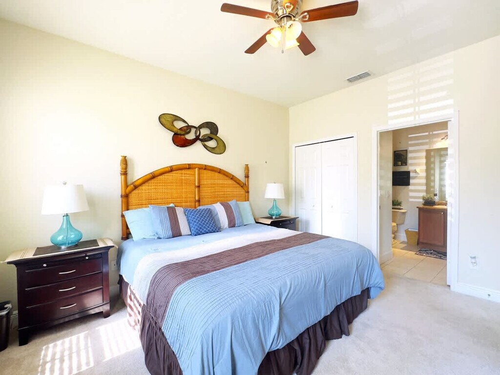 Welcome to your relaxing Florida escape! This beautifully furnished 4-bedroom, 3.5-bathroom townhome is located in the gated and family-friendly Regal Palms Resort in Davenport. With space for up to 8 guests, two king suites, and access to a heated resort-style pool, this property is ideal for families or groups visiting Orlando’s top attractions, including Walt Disney World, just a short drive away. This spacious two-story townhome features a fresh, modern décor with a clean and cozy ambiance. The comfortable living area is equipped with smart TVs in all bedrooms for personalized entertainment. The fully equipped kitchen boasts stainless steel appliances and all cooking essentials, complemented by an open dining area with seating for the whole group. Enjoy high-speed Wi-Fi, central air conditioning, and the convenience of an in-unit washer and dryer. A mandatory resort fee of $20 USD per day per property is required by Regal Palms Resort, granting full access to all resort amenities. Optional pool heat is available for an additional cost, which must be purchased for the duration of your stay. Located in the heart of Davenport, Regal Palms Resort offers a perfect blend of comfort, convenience, and fun for the whole family. Enjoy resort-style amenities including a tropical swimming pavilion with a lazy river, water slide, and heated pools. The resort is just minutes from the magic of Disney World and close to shopping, dining, and top golf courses. Nearby attractions include Walt Disney World, Universal Studios, and SeaWorld Orlando, all within a short drive. Quiet hours are between 10:00 PM and 6:00 AM. The property is strictly non-smoking and non-vaping, with a minimum fine of $500 for violations. Pets are not permitted, and any discovery of a pet will incur a $450 cleaning fee and possible eviction. Check-in is at 4:00 PM, and check-out is before 10:00 AM. Late check-out without prior arrangement may result in a $75 fee. Trash must be placed in designated carts, with a $100 charge for non-compliance. Pool heat is an optional amenity available for an additional cost. [SI]