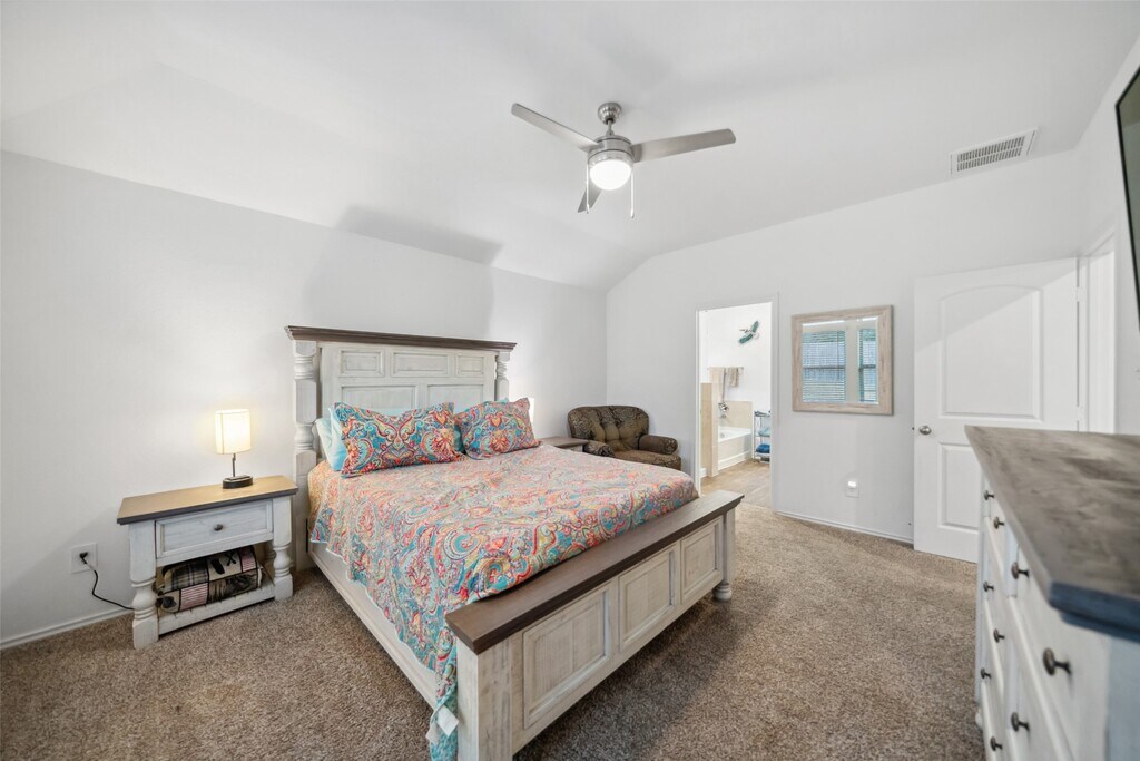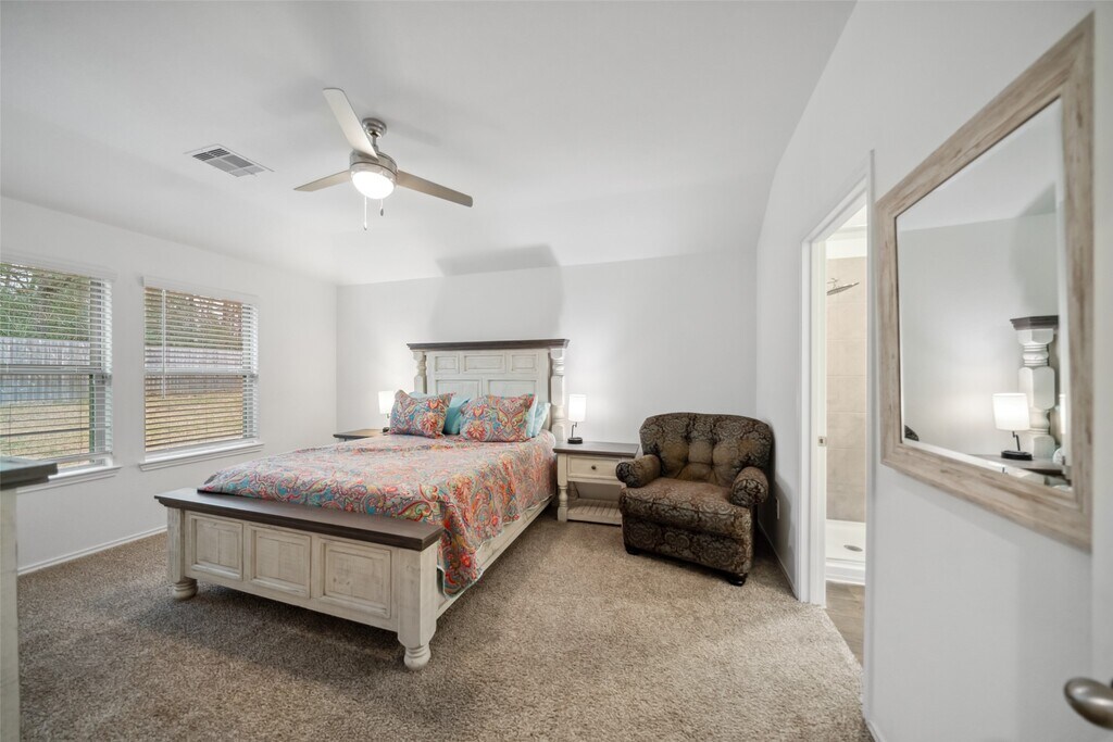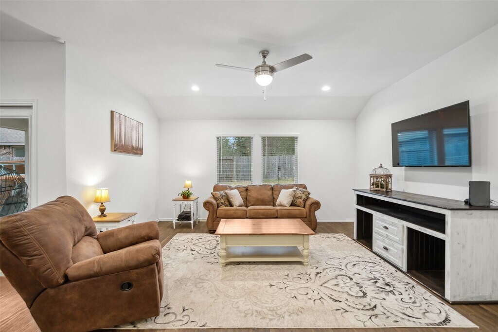 Lovely,4 bedroom single-story home,near The Woodlands is situated on a huge culdesac lot. Solar panels for reduced electricity costs. The 3 year home features neutral colors throughout with large open spaces for entertaining. Beautiful kitchen is stocked with the essentials & features a large granite counter height breakfast bar & walk in pantry. The primary bedroom is furnished with a queen size bedroom set & a lovely bathroom with a large soaking tub,separate shower & large walk-in closet. The 3 secondary bedrooms are split off the main entry. One is currently furnished with a bedroom set,one is currently furnished as a home office & one is empty. The backyard features a covered patio & a lovely view of the woods behind the home. The home is conveniently within walking distance of Carl Barton Park & its playground,hiking trails & pickleball/tennis/basketball courts. Conveniently located 4 miles off of 45 and a great 15 min access to The Woodlands amenities. MLS# 9498532