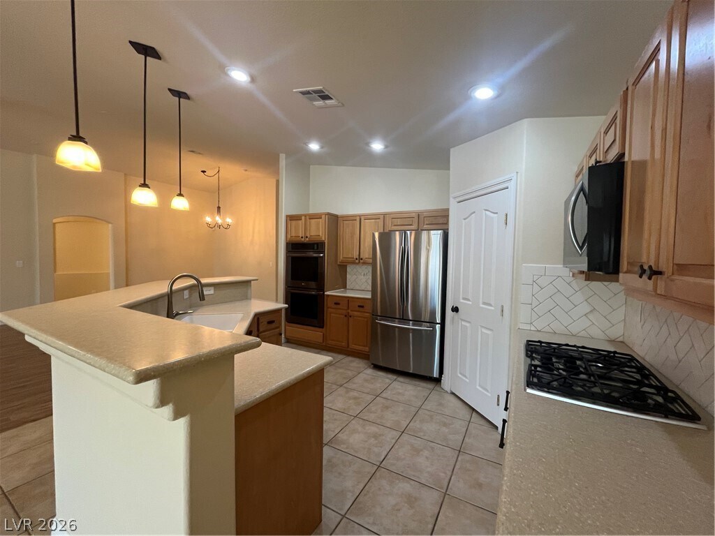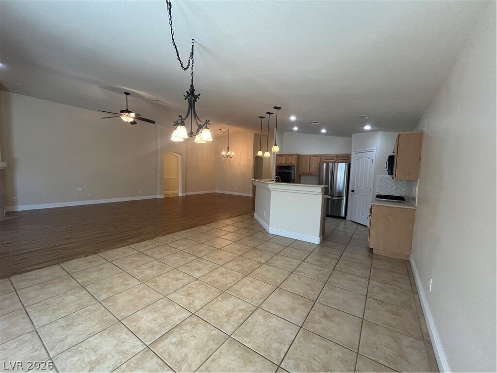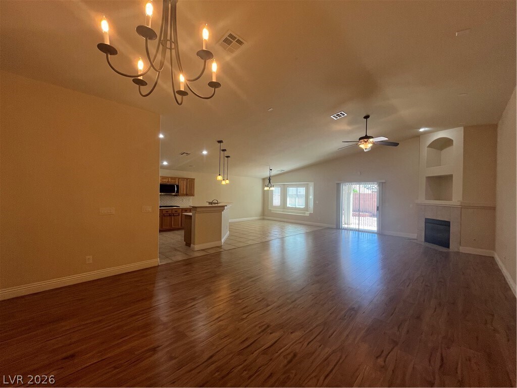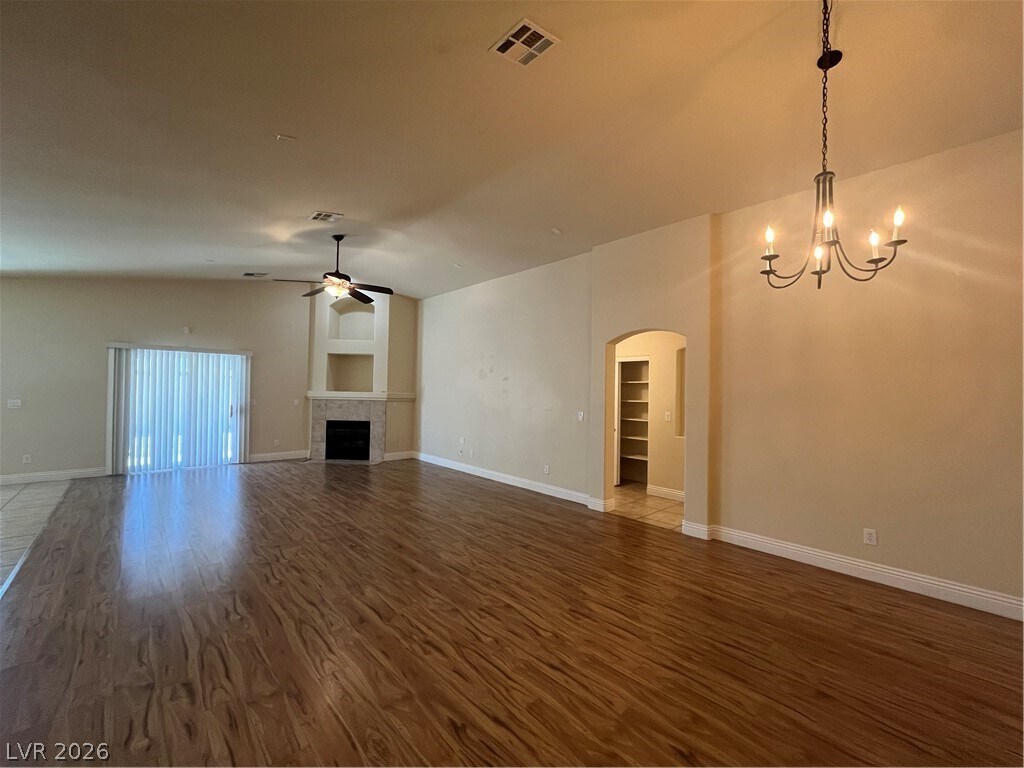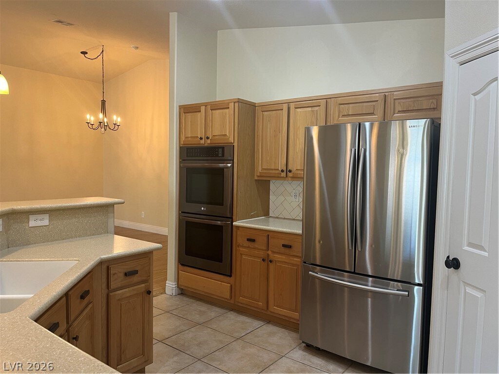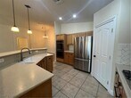 Lovely all single story neighborhood. Large open great room style floor plan with laminate wood floors and ceramic tile throughout. Great room with vaulted ceilings, ceiling fan & light, gas fireplace and new laminate wood floors two tone paint. Formal dining room with vaulted ceilings and laminate wood floors & two tone paint. Large open kitchen with island with corian counters, raised oak cabinets, stainless steel appliances to include double built in oven, refrigerator, microwave & dishwasher, pendant lights, walk in pantry, large dining nook & two tone paint. Large primary suite with ceiling fan & light, new laminate wood floors, vaulted ceilings & two tone paint. Primary bath has separate tub & shower, dual sinks and walk in closet. Bedroom 2 & 3 with ceiling fan & light, new laminate wood floors two tone paint. Laundry room with built in cabinets and large linen closet. Backyard features full covered patio, desert rock landscaping.