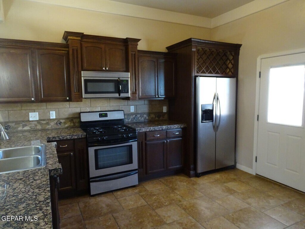 Modern Comfort Meets Eastside Convenience! Welcome home to this stylish 4-bedroom,2-bath gem perfectly located near Edgemere Blvd and N Zaragoza Rd. Designed with an open-concept floor plan,this home offers effortless flow and modern sophistication throughout. The chef-inspired kitchen features granite countertops,stainless steel appliances,and rich dark wood cabinetry,making it the perfect place to cook and entertain. Relax in the spacious master suite,complete with a luxurious ensuite bath,or gather in the inviting living area by the cozy fireplace. Enjoy easy-care living with ceramic tile flooring throughout,and take advantage of the double-attached garage and refrigerated air for year-round comfort. Step outside to a large backyard with an extended covered patio—ideal for weekend barbecues,family fun,or peaceful evenings under the El Paso sky. Located close to Loop 375,I-10,and Fort Bliss,this home offers both modern style and unbeatable convenience.