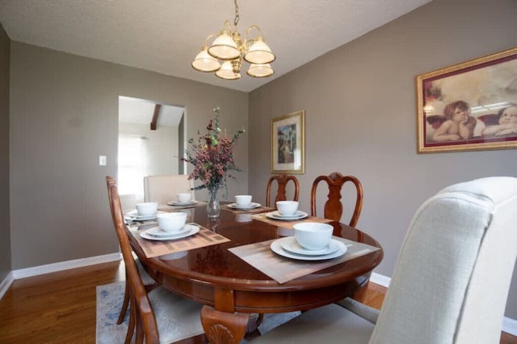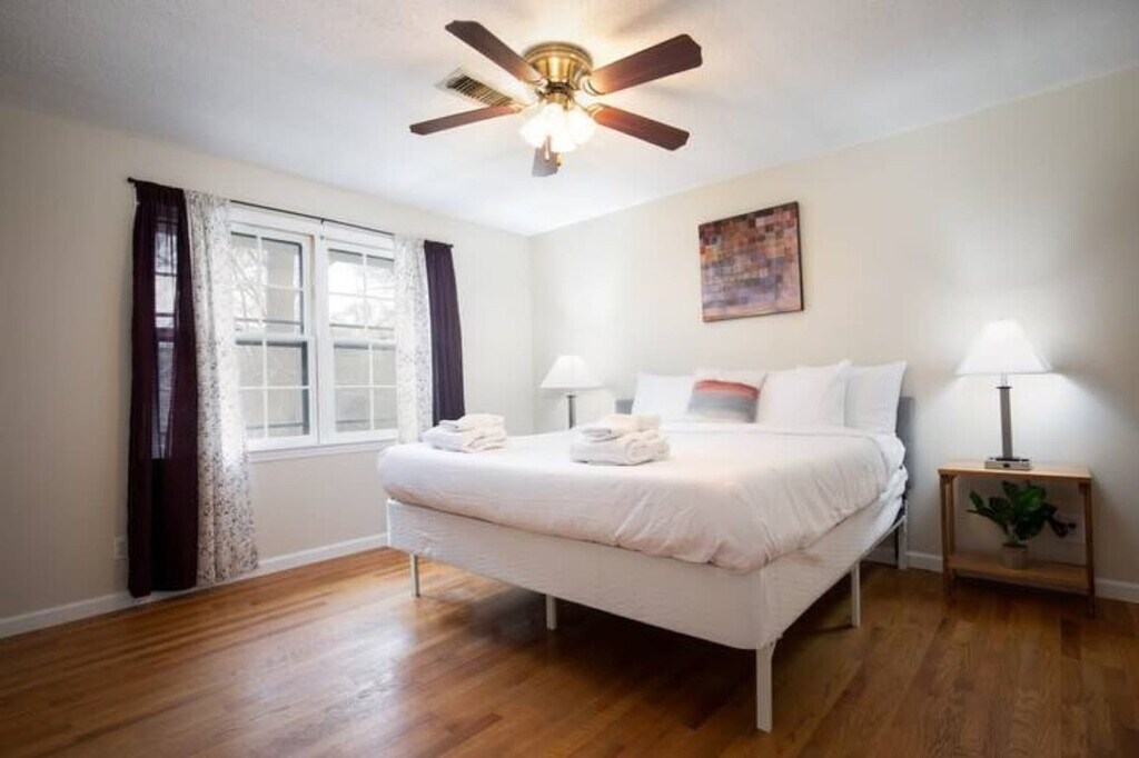 Feel at home in this charming 4-bedroom, 2-bath home in Forest Hills, which comfortably sleeps up to 11 guests. This home evokes a family-friendly feel. Downstairs has a living area with two armchairs, a couch, a queen sofabed, and a 50" Roku TV. There are two bedrooms downstairs, one with a queen bed and another with a queen bed, and a full bathroom with a tub. There is a full kitchen with all of the basic amenities necessary for cooking a home cooked meal. Upstairs has a king-size bedroom, another full bathroom, and another bedroom with two twins. The outdoor deck looks out over a fully fenced yard and has a table and chairs for enjoying the weather while watching kids and pets play. Free Wi-Fi is included. A Pack-N-Play and vacuum are available upon request. Centrally located less than fifteen minutes from downtown, the Legacy Museum, and the Rosa Parks Museum, this home is also just six miles from the new White Water Park. This home is located in the Forest Hills district of Montgomery, close to food, shops, attractions, and museums. This is a residential area, so driving is recommended, but Uber and Lyft are available as well. Quiet hours are between 10 PM and 7 AM. If our cleaning crew reports any signs of smoking cigarettes, vapes, e-cigs, pipes, etc. (smell, ash, etc.) in or around the home, an automatic $500 damage charge will be incurred. The same charge applies if cigarette butts are found outside of the home. If marijuana is smoked in or around the home a $500 fee will be charged, and details about the reservation may be turned over to the appropriate authorities. Parties are prohibited at the home. Other events are permitted at the home only with prior approval. If quiet hours are violated and the neighbors are disturbed, the reservation will be canceled, the guest will be required to leave the property immediately, and the guest will not be eligible for any refunds. Noise may be monitored with exterior cameras and/or noise monitoring technology. Guests are responsible for any damage to the home or its furnishings during the stay. All pets require a non-refundable pet fee. Pets must be crated when they are left unattended in the home. Pets are not allowed on furniture or beds, and all waste must be cleaned up from the yard. If there is evidence of pet hair on the furniture, excess hair in the home, stains, or waste found in the yard or home, the cost to clean this will be charged. All trash must be bagged and placed in the bins provided. There is a $100 charge for third party trash removal if an excessive amount of trash is left at the property. Guests must be at least 21 years of age to rent this property. The dining room seats six and can double as a large mobile work and learning station when not enjoying family meals. [SI]