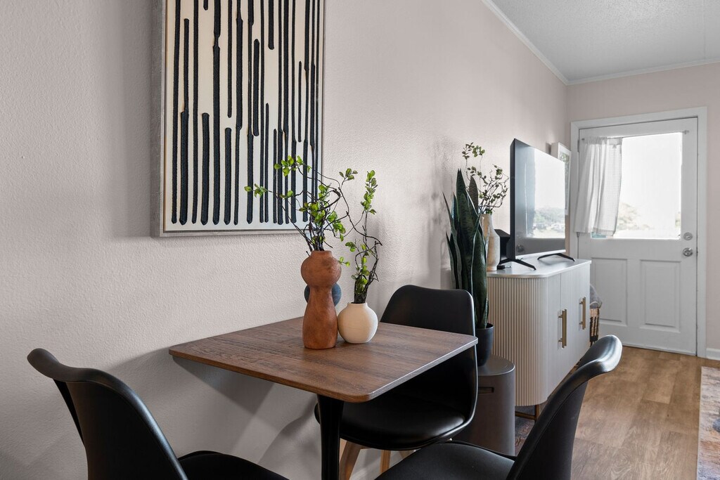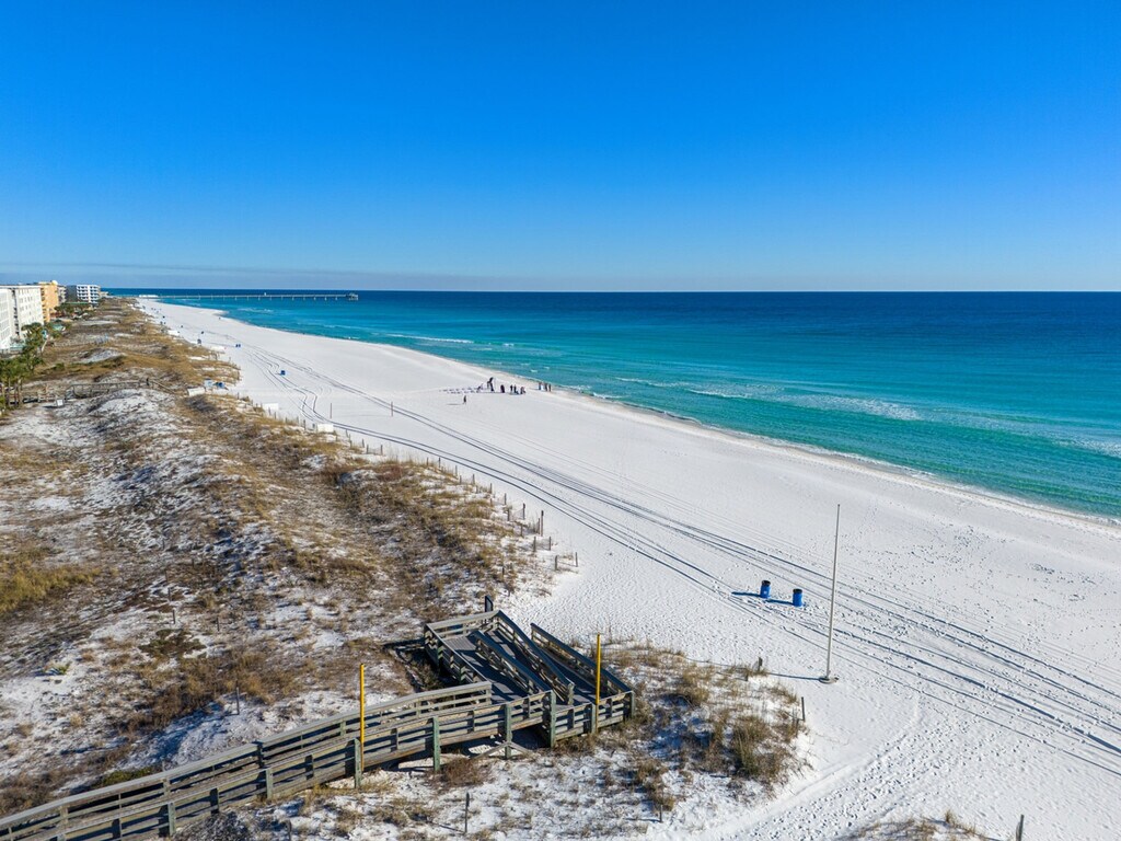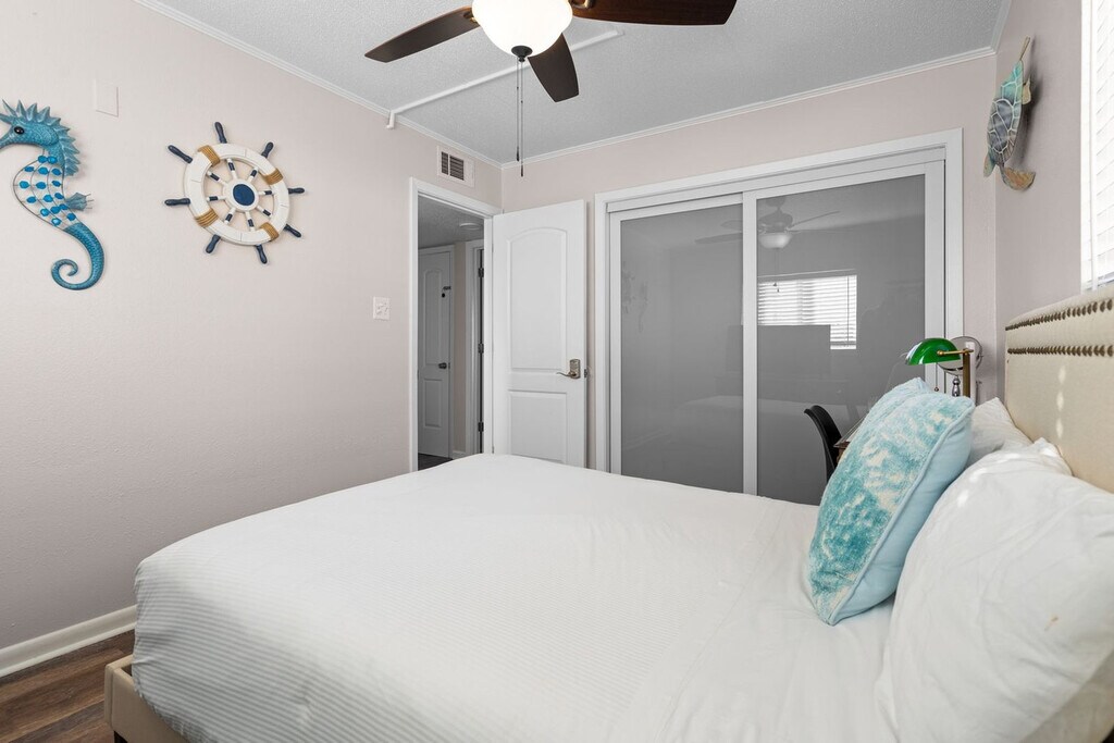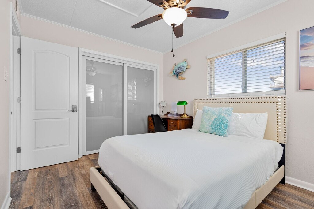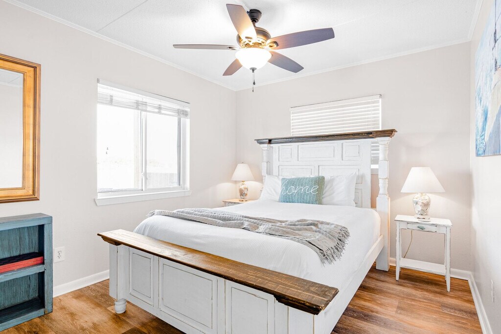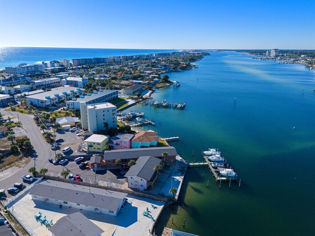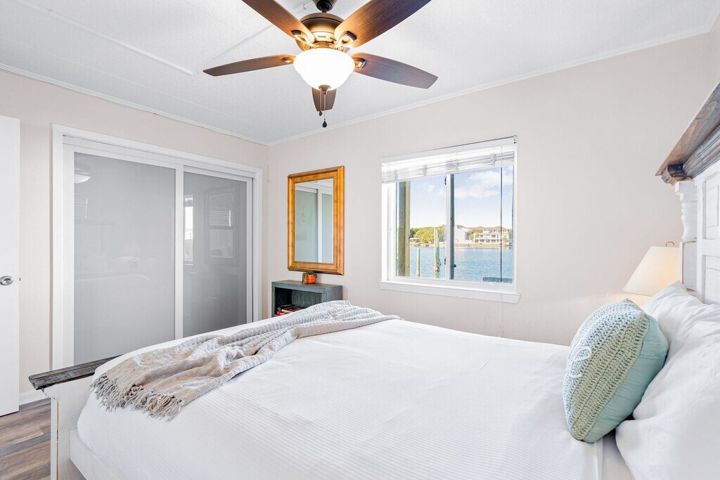 The advertised rate of $4,383/month is the lowest available price, based on a 30 day(s) stay with a move-in date of August 9, 2026. Rates vary depending on the duration of stay, season, and other parameters. For exact pricing and additional pricing components, please visit our website and enter your desired move-in and move-out dates. The rate is applicable when billed upfront; it can be higher if billed in multiple payments. Feel at home in this brand-new, rare ground-floor waterfront condo on Okaloosa Island, offering sunrise views and breezy boho vibes. One of just two walk-out waterfronts in a quiet 12-unit complex, this 2-bedroom retreat offers a dock and is just a 6-minute walk to the sugar-white sands of the Gulf via Beach Access 1. This fully stocked condo features Smart TVs and coastal decor. The kitchen is fully stocked with stainless appliances and granite countertops, and includes both drip and K-cup coffee makers. A small table for two is perfect for breakfast indoors, while a table for four on the patio lets you dine with a waterfront breeze. Both bedrooms feature queen beds, Smart TVs, and relaxed coastal touches. The bathroom has a fresh vanity, new paint, and a tub/shower combo. Towels, shampoo, conditioner, and a hair dryer are all provided. A coin-operated laundry room is right next to your assigned parking spot. The shared dock is a perfect spot for fishing, sunrise coffee, or evening stargazing. A slip is available for vessels up to 25 feet. Located on the north peak of Bluefish Drive, this waterfront condo offers a quiet, tucked-away setting that still keeps you close to everything. Beach Access #1 and #2 are just a short walk away. The neighborhood blends a laid-back, family-friendly atmosphere with easy access to local favorites. The Okaloosa Island Pier and The Boardwalk are just down the beach, where you can enjoy fresh seafood, ice cream, and shopping. Gulfarium Marine Adventure Park, Wild Willy’s Adventure Zone, and downtown Fort Walton Beach are just a few minutes away. Destin is a quick 10-minute drive, making it easy to explore HarborWalk Village, charter a fishing trip, or try out some of the Emerald Coast’s best restaurants. Guests agree to pay a $500 smoke damage cleaning fee if any sign or smell of smoke is encountered after check-out. Pets are not allowed at this property. Check-out time is 10 am, and guests agree to pay a $50 fine if not checked out by the specified time. Only the specific number of guests noted in the booking are allowed on premises unless approved in writing. If the guest exceeds the occupancy noted in the reservation, all guests and/or visitors will be immediately evicted without refund for unused days remaining. The guest also agrees to pay a charge of $20 per person per day for every visitor not identified in the reservation. [SI]