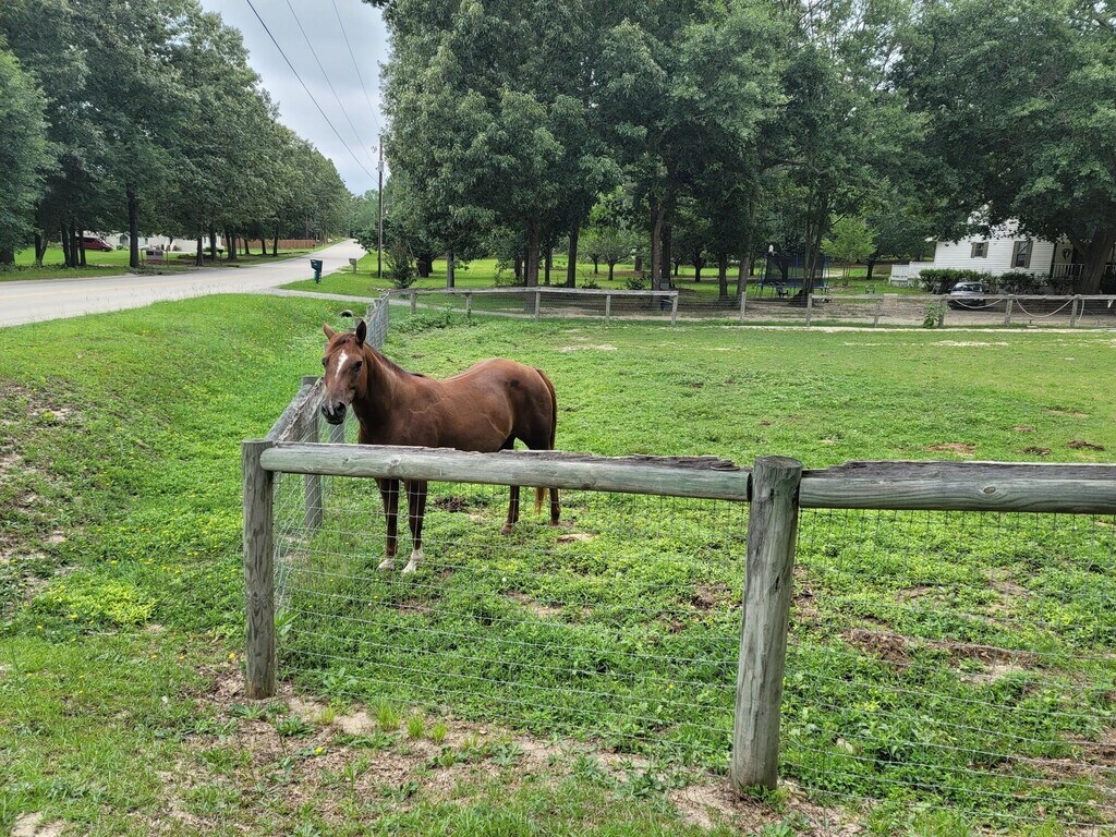 Agent is the owner of this home. Enjoy the peaceful setting of the country,but the convenience of being within 3.5 miles from the new Publix on Silverbluff Road. restaurants,and shopping. Fenced paddock with one walkthrough gate and one drive through cattle gate. Covered shed with cattle gate corral to enclose a horse if needed. There is a small shed that I used for my saddles. There is another small shed that has the water heater in it. 9 x 20 storage shed. Primary bedroom on the main level with a walk-in closet and another separate closet. 2 bedrooms upstairs are small with vaulted ceilings with 2 large double closets. There is another room(bonus) downstairs that has an exterior door to the back deck. This room has been used as a bedroom. It has 2 double closets in it as well. Kitchen is loaded with cabinets. Flat surface stove. Side by side refrigerator,pantry in kitchen. Extra storage under stairwell. High vaulted ceilings in living room. Oversized laundry room. 22 x 6 front porch with swing. 27 x 18 back deck. Plan to paint it when weather warms up. The well is located in the open area at the top of the hill.
