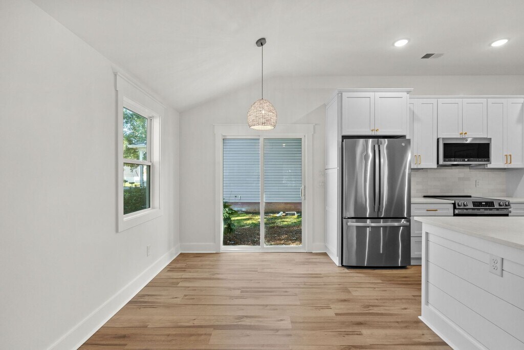 Walk to the beach in minutes! This charming and fully remodeled two-bedroom, two-and-one-half bath home is located on the ocean side of Highway 17 Business in Surfside Beach. This unfurnished home is nestled among trees on a large lot. This home has hard surface flooring throughout. Kitchen features white cabinets, tile backsplash, and stainless steel appliances. It includes a smooth-top stove, oven, refrigerator, and microwave. The island with an undermount sink features blue cabinets as an accent. The primary bedroom has a private bathroom with a modern, tiled, step-in shower. There is a second bedroom and a bathroom. A stackable washer-dryer is provided as-is with no warranty. Rent: $2,495. per month. Tenant is responsible for all utilities. Security deposit: $2,495. Renters insurance is required. Pets are not permitted Property is non-smoking. Proudly managed by Southern Coast Management Offices hours are Monday through Friday, 9:00 am to Noon and 1:00 - 5:00 pm. Call for additional information and to arrange a viewing. Key is available for pickup before 3 pm by appointment only. Applications are accepted online only at Background check, rental history, income verification, and credit check are required.