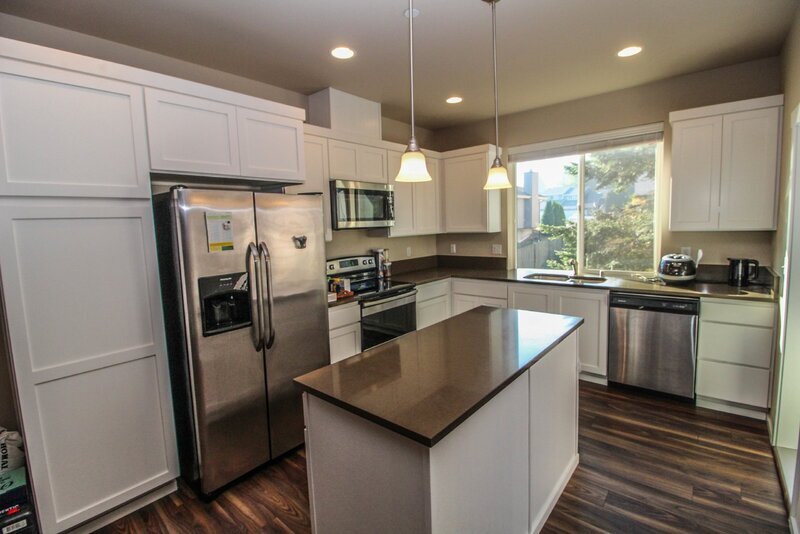 Newer Townhome in excellent location with easy access to freeways, nearby grocery and restaurants. * Two bedrooms upstairs, both with private baths and their own walk-in closets. * Attached garage is 2 cars deep with room for shop, home gym, extra storage. * Off the garage is a private yard, fully fenced. * The kitchen features white cabinets and quartz counters. * Center island with overhang bar to fit 3 or 4 bar stools. * Off the kitchen is a covered deck/balcony. * Vinyl plank flooring on the main floor. * Living room with space for computer desk. * Upstairs washer and dryer. * Newer Carpet Small dog considered. No cats. Presented by Gregory Property Management. Call with questions 9 am to 5 pm Monday through Friday ** To schedule a tour Call our 24 hour SELF SHOWING HOTLINE 425. 217.3598. OR visit our web site Gregory Property Management dot com and click ""schedule a showing"""
