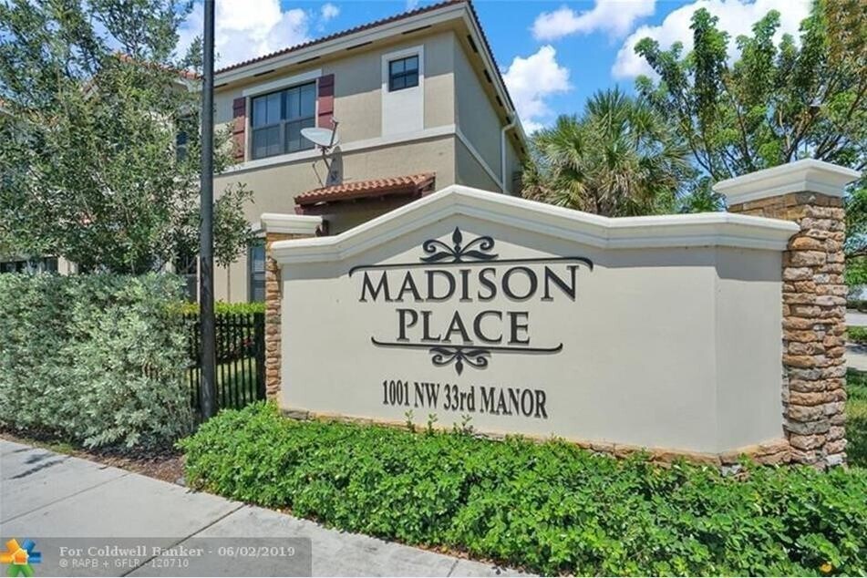 Beautiful and clean 3 beds 2 1/2 baths Townhouse located at a great gated community of Pompano Beach called Madison Place. This town home features beautiful kitchen, stainless steel appliances, tile floors, clean carpets in bedrooms and much more. This is a great family community with a fantastic clubhouse and kids park, pool and breathtaking lake view. Rooms and closet are spacious. Schedule your showing today
