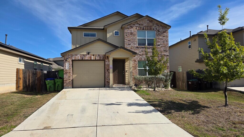 Freshly painted two-story home 15 minutes from Lackland Air Force Base and Culebra Rd., but outside city limits. Being outside city limits the neighborhood does not have city trash/recycle pickup but I will continue to keep the contract I have for whoever moves in. Quiet neighborhood with friendly neighbors. Single car garage has been fitted with shelves and pegboard. Most appliances included (fridge, washer, dryer, microwave, water softener, lawn mower etc.). Stone doghouse in the backyard with doggy door for mid-sized pups to access the yard. Two pantries and Master Bedroom has it's own in-room bathroom. Access to community pool and playground. All bedrooms have walk-in closets.