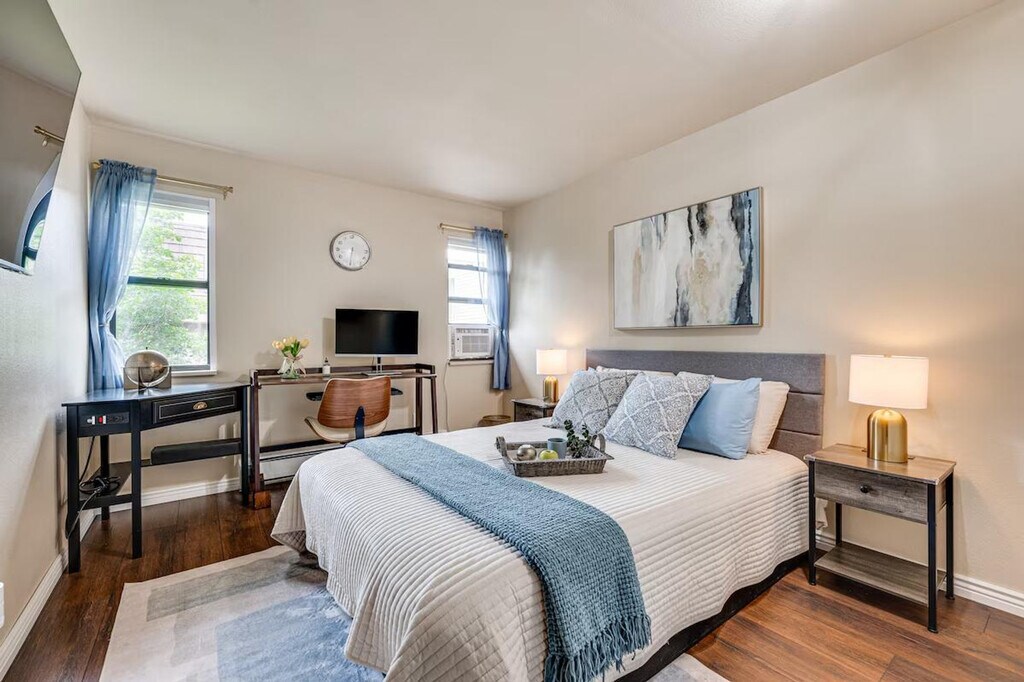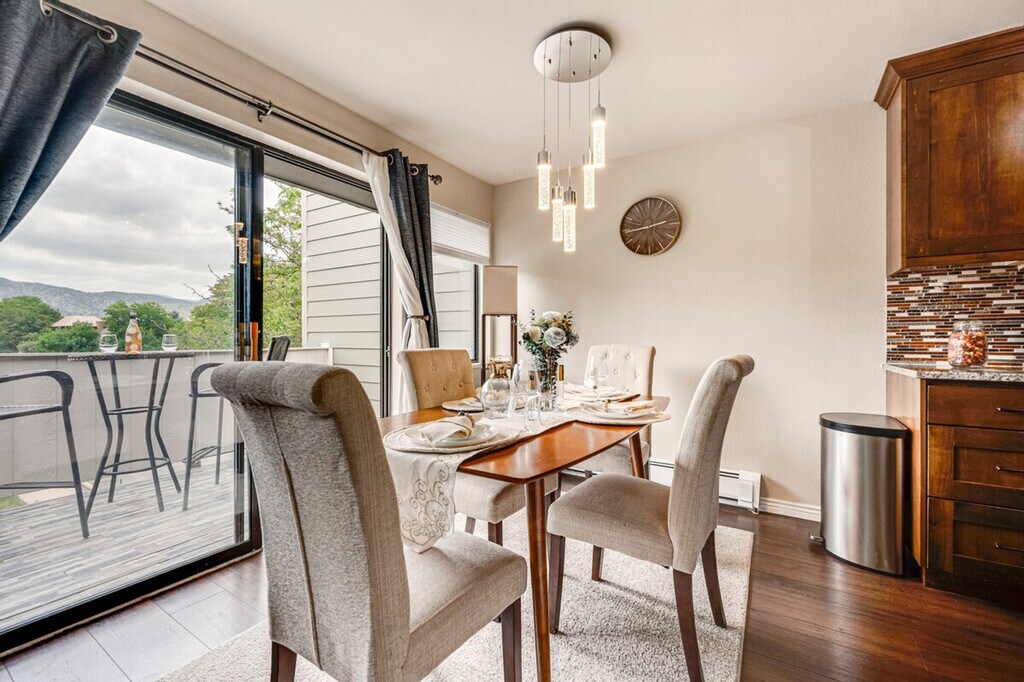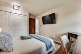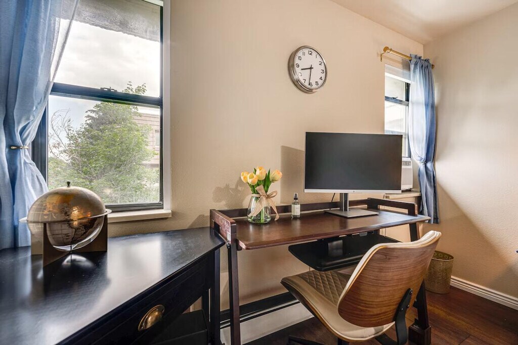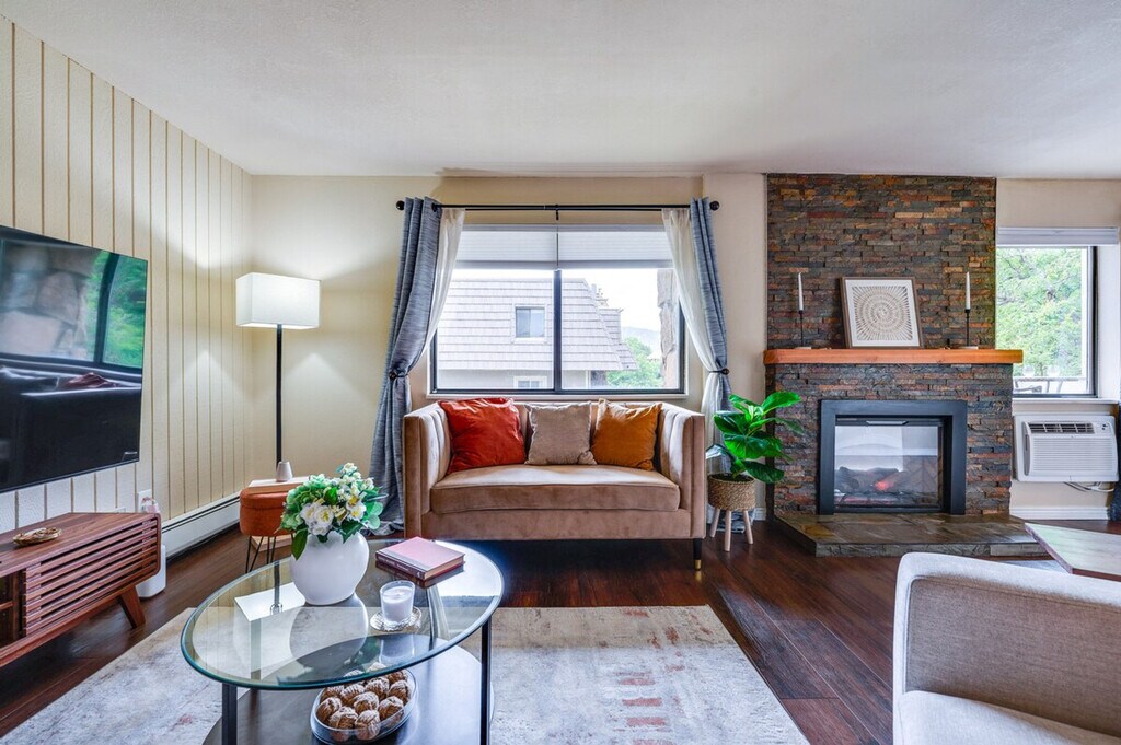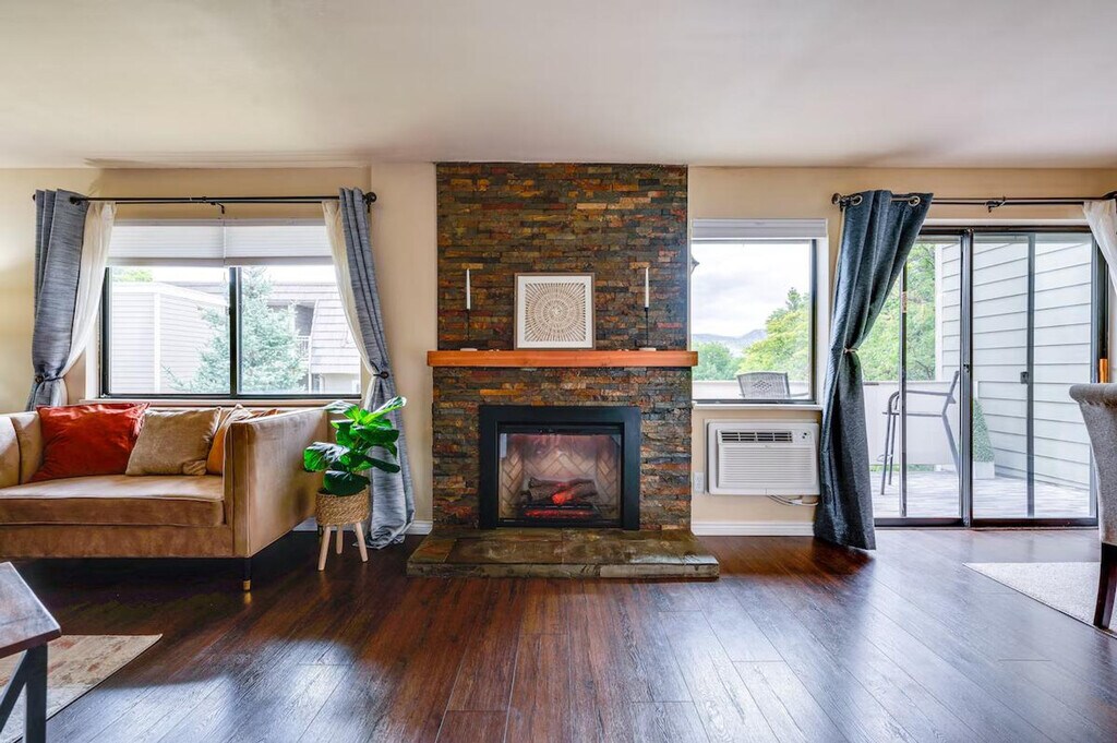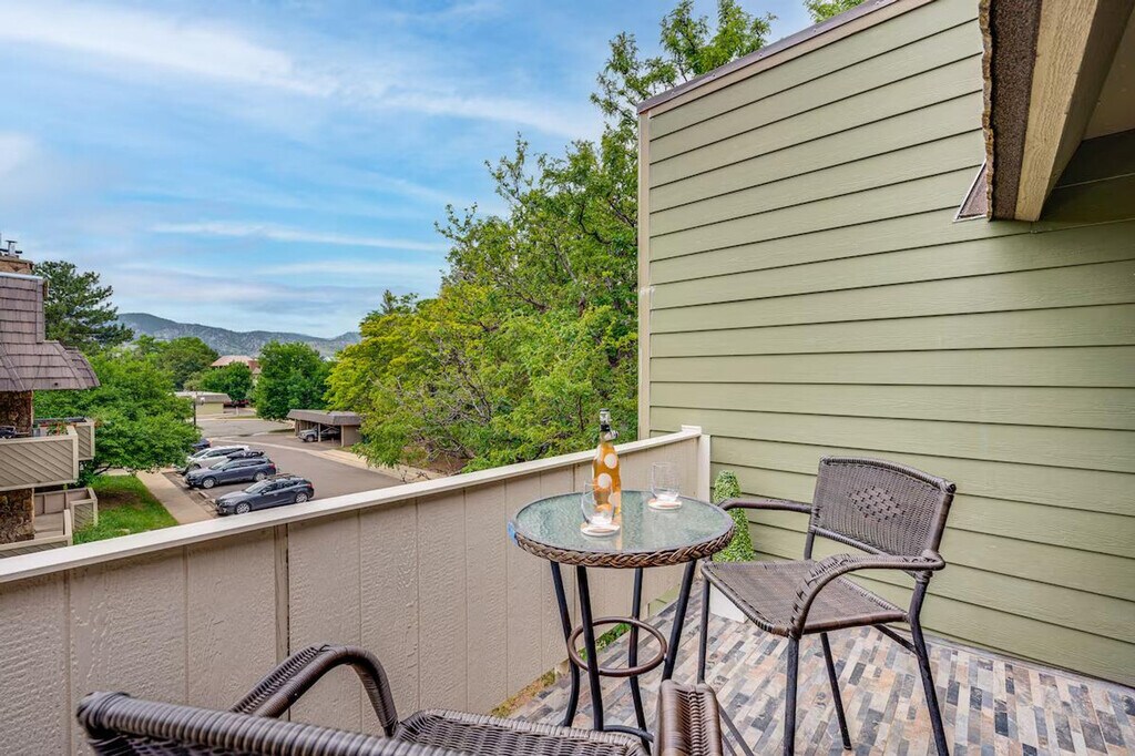Feel at home in this 1-bedroom, 1-bath condo in Boulder. This 3rd-floor, single-story condo requires climbing two flights of stairs to access. This condo offers a spacious living room, a furnished balcony with mountain views, and an electric fireplace. Entertainment is provided by two smart TVs. The kitchen is equipped with an electric stove, oven, microwave, espresso machine, drip coffee maker, coffee grinder, electric kettle, dishwasher, refrigerator, toaster, blender, Ninja Foodi multi-cooker, spices, a starter coffee/tea kit, dishware and flatware, cooking basics, and a knife set. Additional features include central heating, window a/c units, towels and linens, complimentary toiletries, a hair dryer, hangers, and an iron/board. Guests have access to Remington Post's community sports courts and clubhouse, which includes an indoor pool, sauna, clubhouse with co-working room and Wi-Fi, fitness center, tennis and basketball courts, and coin laundry. Assigned covered parking is available for one vehicle, and there is also a community lot. Live like a local at this Boulder vacation rental, where elevated relaxation pairs with the area’s legendary landscape. Enjoy sunrise hikes or meander Pearl Street on your off days. Then return to the peaceful sanctuary and plan your next move under the Colorado stars. Quiet hours begin at 10:00 PM. There is one exterior security camera facing out. No pets are allowed. Events, parties, or large gatherings are prohibited. Guests must be at least 18 years old to book. Includes a desk workspace and computer monitor. [SI]
