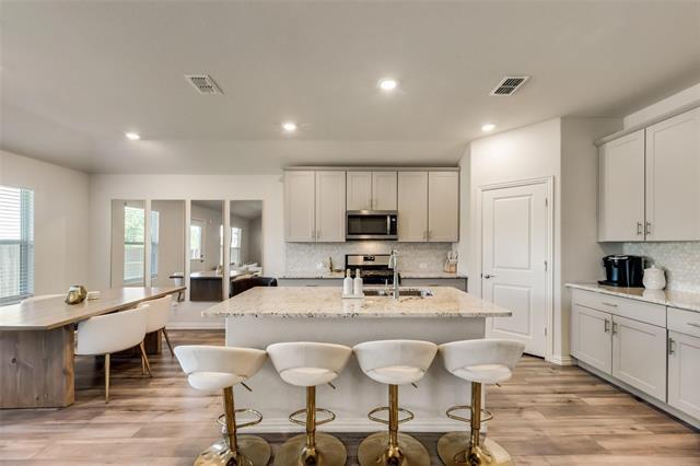 Beautiful 2022-Built Energy-Efficient Smart Home in Kings Ridge that is move in ready! Welcome to the Greenville plan — a thoughtfully designed, energy-efficient home built for modern living. The spacious kitchen features light gray tall cabinets, granite countertops, and a large island that opens seamlessly to the living area, perfect for entertaining or keeping an eye on the action while you cook. Stylish EVP flooring and multi-tone carpet add a contemporary touch throughout the home. Enjoy an active lifestyle with North Lakes Park and the nearby recreation center just minutes away. Located in highly rated Denton ISD, students have walkability to the brand-new high school right across the street! New Reeves Elementary across the way that just opened in August of 2025! Kings Ridge offers unbeatable access to shopping, dining, and major employment centers. Built with advanced energy-efficient features, this home helps you live a healthier, quieter lifestyle.