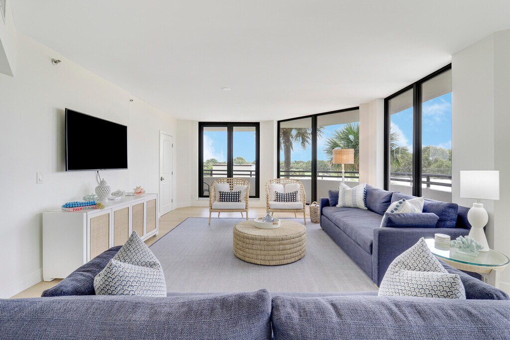 A spacious, designer-furnished condo is available for annual rental in Jonathan's Landing, in Southporte One the community's only high-rise. This stunning condo is situated along the golf course and just minutes from Jupiter's amazing restaurants, beaches, shops, and Palm Beach International Airport. Southporte One, a recently renovated building, boasts a beautiful community room and kitchen, as well as tennis courts and covered parking. Golf cart use is included with the rental. Let the photos showcase the charm and luxury of this exceptional condo!