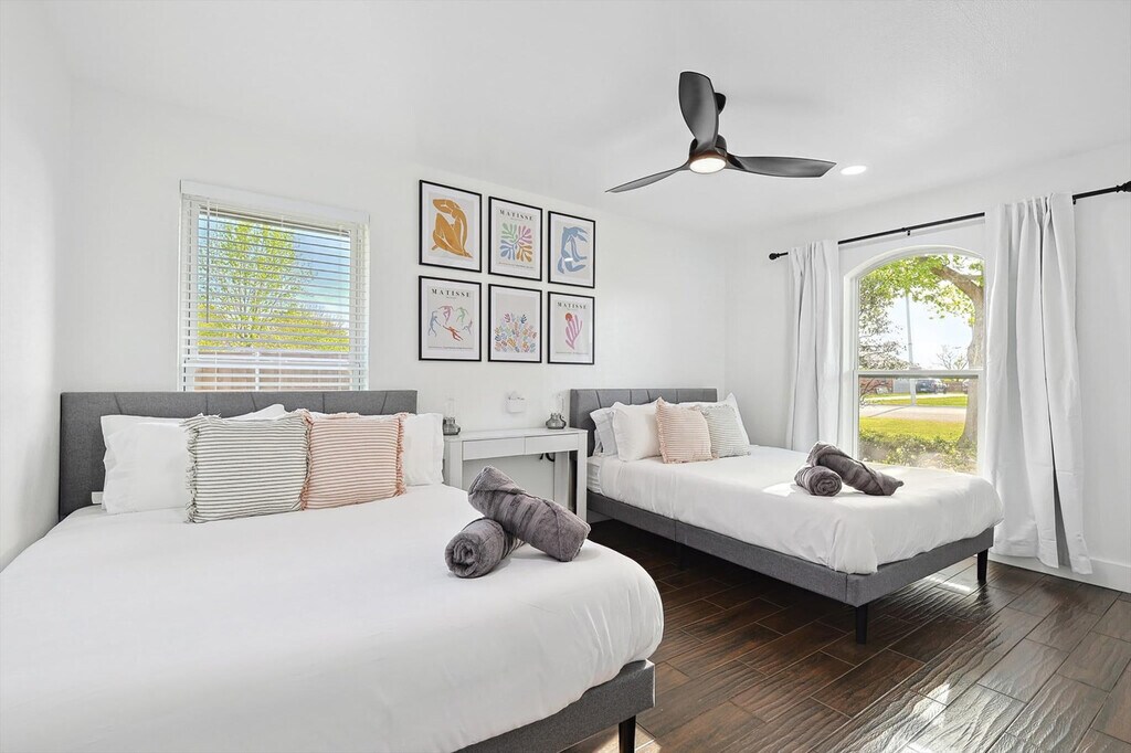 Get ready for a delightful retreat in this spacious four-bedroom holiday home, where you can BBQ, relax in the sunshine by the pool, and enjoy the huge backyard. Unwind in the soothing hot tub under the night sky. This sanctuary offers peace and relaxation, away from the hustle and bustle, yet conveniently close to numerous city attractions. Experience Texas like few get to, creating lasting memories with loved ones. The home's sleeping arrangements are as follows: all bedrooms are on the first floor. The primary bedroom features a king-size bed, the second bedroom has a queen-size bed, the third bedroom includes two queen-size beds, and the fourth bedroom offers a queen-size bed and a bunk bed (three beds total). All linens and towels are provided, although pool towels are not included. The kitchen is perfect for preparing meals with a large dining table, kitchen bar area, and breakfast nook. House-trained pets are welcome with a $150 fee per pet. From the seventh guest onwards, a $39 fee per guest per night applies. The fourth bedroom opens for groups of eight or more guests. This peaceful Denton neighborhood offers a serene, family-friendly atmosphere, perfect for those seeking a relaxing stay. With easy access to local parks, schools, and the charming downtown area, guests can enjoy both quiet suburban living and proximity to essential amenities. Ideal for exploring Denton’s culture or unwinding, this neighborhood provides the best of both worlds, combining comfort and convenience. Whether you're here for leisure or business, it’s a great base for your stay in Denton. Only registered guests are allowed, and no parties or large gatherings are permitted. A $500 fine applies for indoor smoking violations, but outdoor smoking is allowed with proper disposal of cigarette butts. The pool is professionally serviced twice a week during the summer months and once a week during the rest of the year. The pool and kiddie pool are not heated, and the kiddie pool jets are not usable. Two security cameras are installed outside for security, none inside. Quiet hours are between 22:00 and 9:00. Check-in time is from 4:00 p.m. onwards, and check-out time is at 10 a.m. max. Unregistered guests are not allowed, and extra guests spending the night that are not accounted for could generate extra fees. All cars must be parked in the property’s garage or driveway, as street parking is strictly forbidden. Drugs and inappropriate behavior are not allowed on the property. Garbage is picked up on certain days by the city, and guests will be informed the night before so they may leave the trash out from 7 p.m. onwards for pick-up at 7 a.m. the next day. Stained sheets or towels must be paid for to replace them. Any violation of house rules could result in reservation cancellation, no refunds, and loss of deposit, depending on the severity of the violation. [SI]