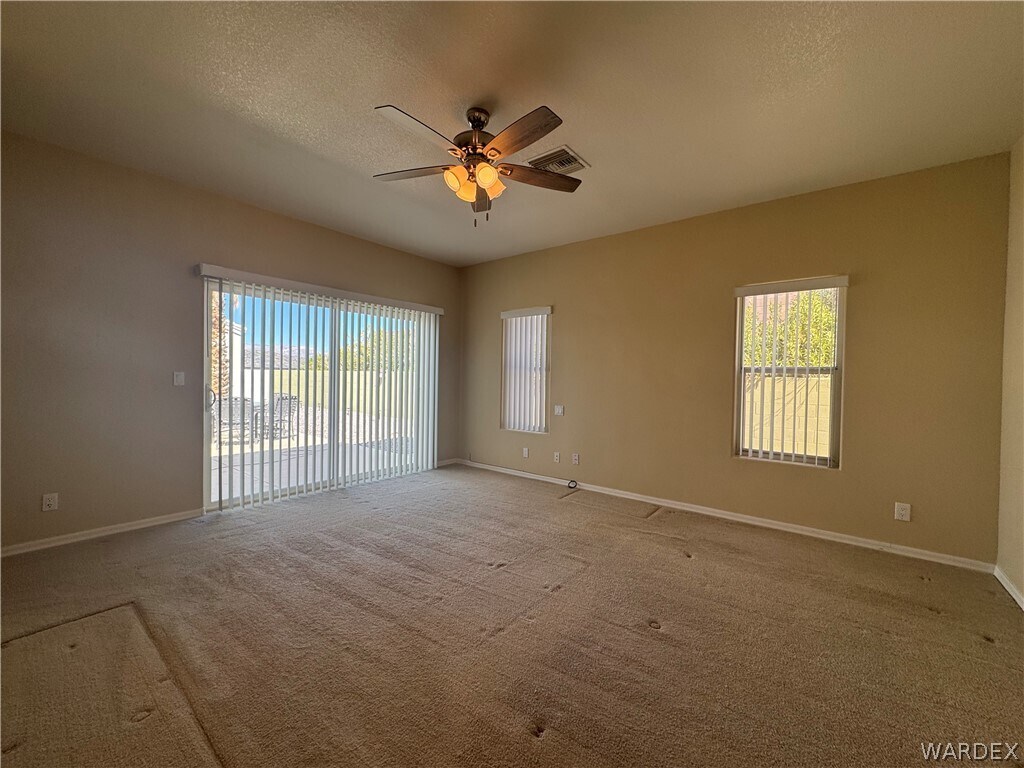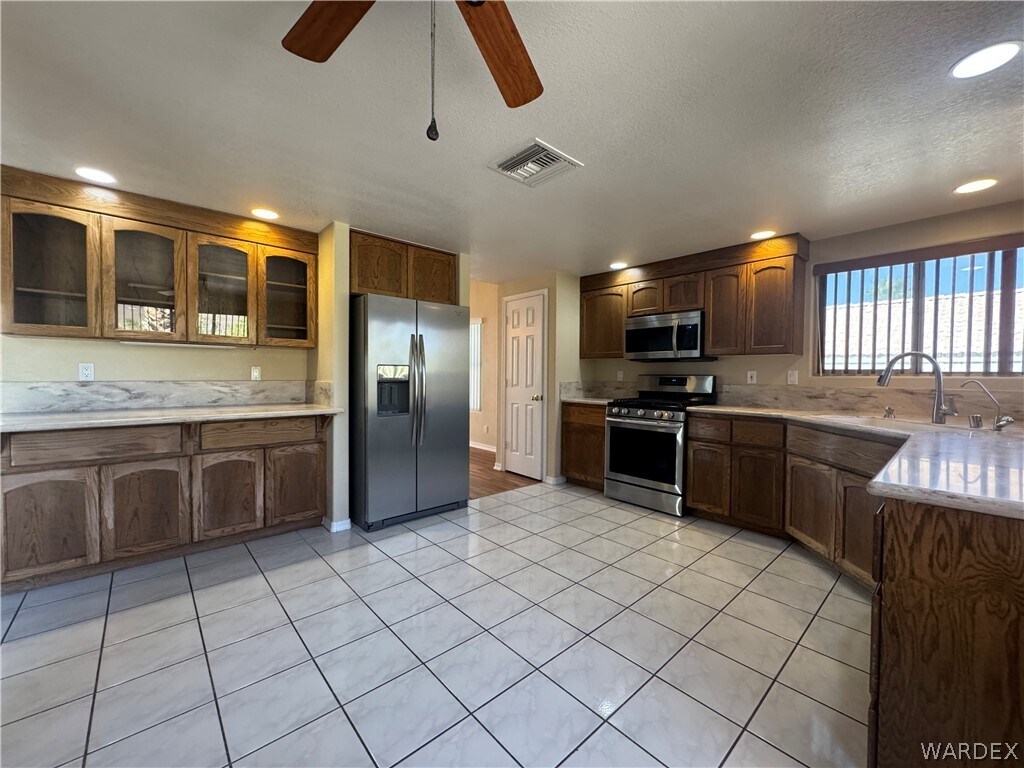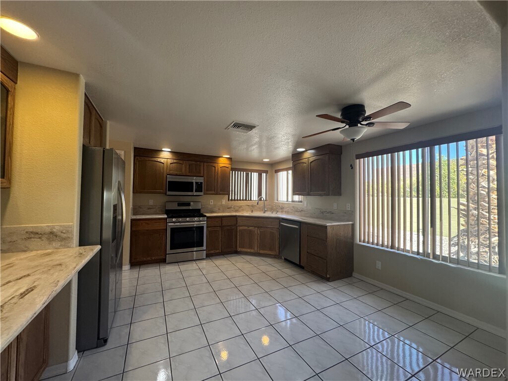 Welcome to this roomy 3-bedroom,2-bath home located in the desirable Sunridge Estates neighborhood of Bullhead City. With over 2,100 sq ft of living space,this single-story home offers a functional layout and plenty of room to spread out. Inside,you’ll find an open floor plan with vaulted ceilings,a spacious living area,and a casual dining space. The kitchen features granite countertops and tile flooring,a pantry,and comes equipped with a gas range,microwave,dishwasher,disposal,and refrigerator—making it move-in ready. A standout feature of this home is the additional rec/family room,perfect for a second living area,game room,or home office. The primary suite includes a walk-in closet and a private bathroom with dual sinks and a glass-enclosed shower. Ceiling fans throughout the home add comfort year-round. Step outside to a fully fenced backyard with block wall fencing,mature landscaping,and a patio—ideal for relaxing or entertaining. There’s also a utility shed for extra storage. The property includes an attached 2-car garage. Conveniently located near Park Crest Dr,this home offers easy access to local amenities,shopping,and dining. This home combines space,comfort,and practicality—don’t miss your chance to make it yours!