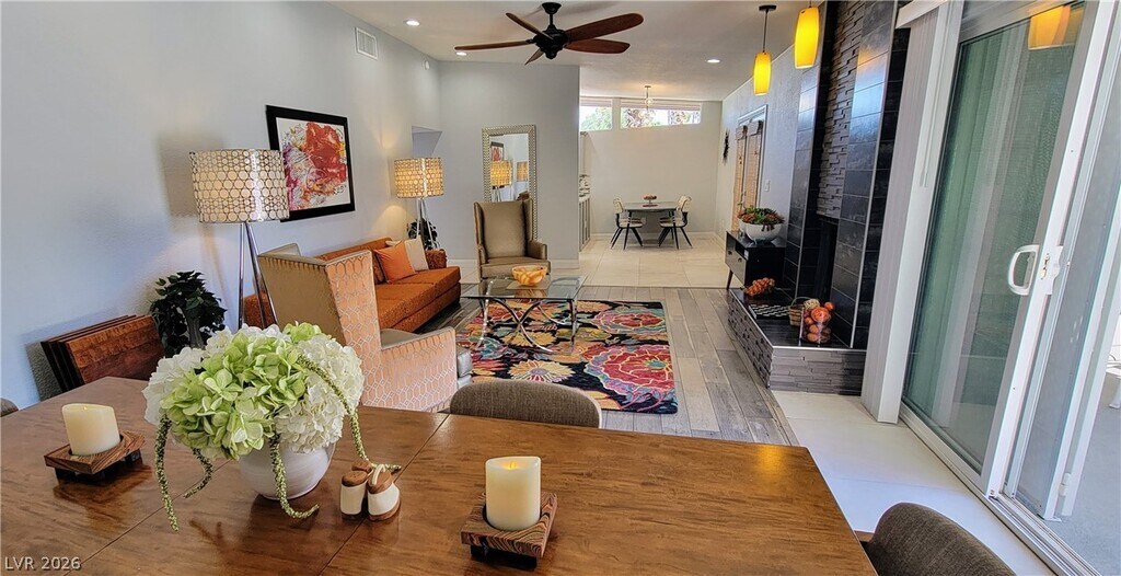 THIS IS A FULLY FURNISHED RENTAL! LANDLORD PAYS POOL SERVICE AND LANDSCAPER. The tasteful furnishings of this home were carefully curated to honor the original mid century modern architecture. The center hallway floorplan features a fully stocked kitchen with all new appliances, quartz countertops, filtered drinking water and filtered icemaker. Breakfast nook with French doors opens to breezeway, garage and covered patio. Family room with fireplace, dining area and sliding doors opens to pool area. Center hall leads to 3 bedrooms and laundry room with washer and dryer, iron, ironing board and clothes rod. The primary bedroom with ensuite bathroom has wall to wall closets and a door leading to the backyard.