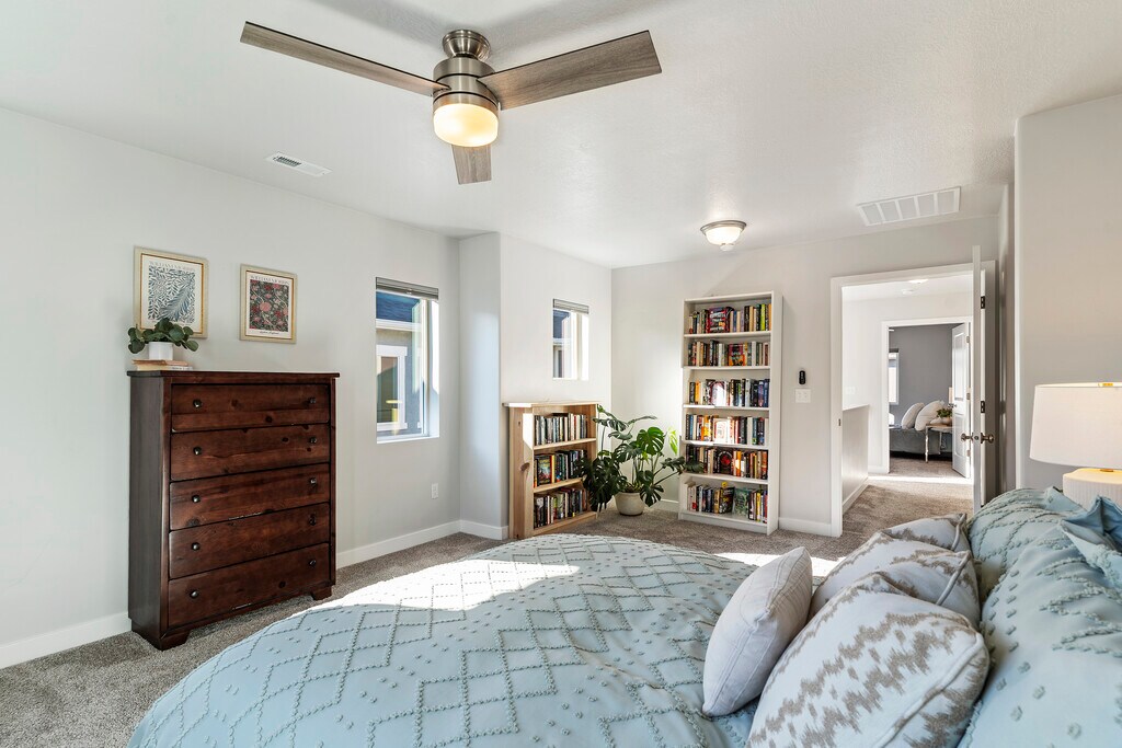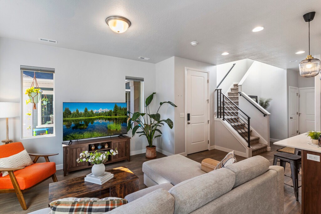Better than NEW, this chic and sleek 2023 END Row townhome is energy star rated. The open concept floorplan and nine foot ceilings flood the home with an abundance of natural light. Clean and modern lines, quartz countertops, two tone maple soft-close cabinets, and stainless steel appliances are just a handful of many amenities. Retreat upstairs to the generously oversized bedrooms with private en-suites separated by the laundry room. Both bedrooms include walk-in closets spacious enough to be furnished as a loft or multipurpose room. An attached two-car garage provides secure parking and has been outfitted with MyQ for enhanced convenience. This home is less than five minutes from the Roy Frontrunner station, making a date night to downtown SLC or an airport commute seamless. The Denver Rio Grande Western Rail Trail, which runs over 23 miles along the West Corridor is also steps away, in addition to countless parks.