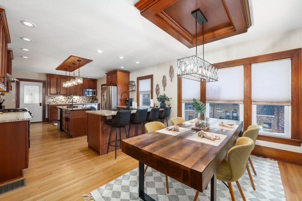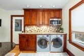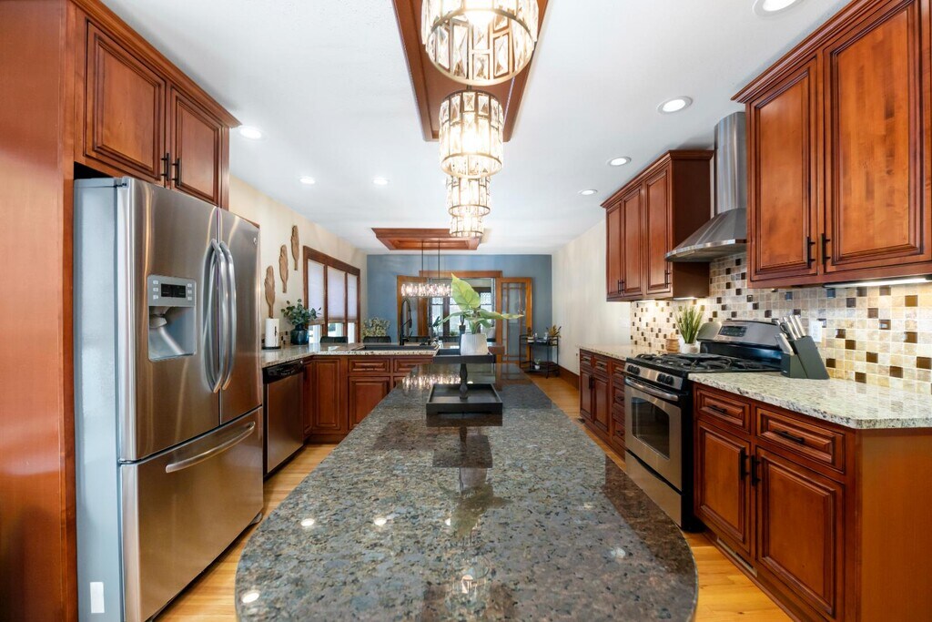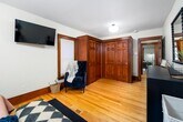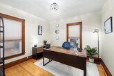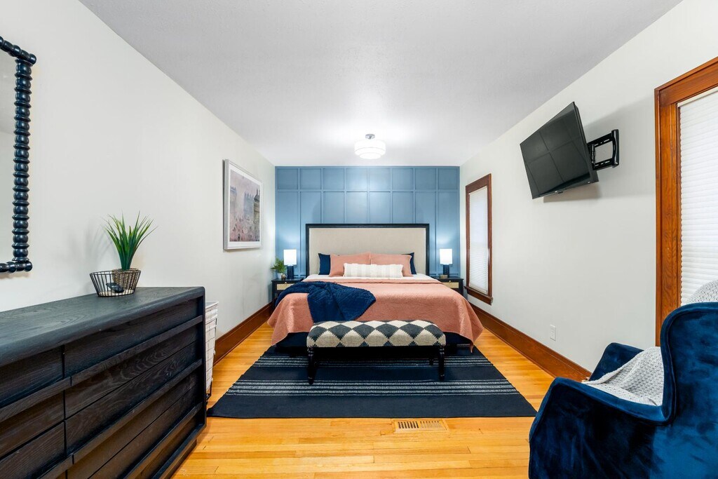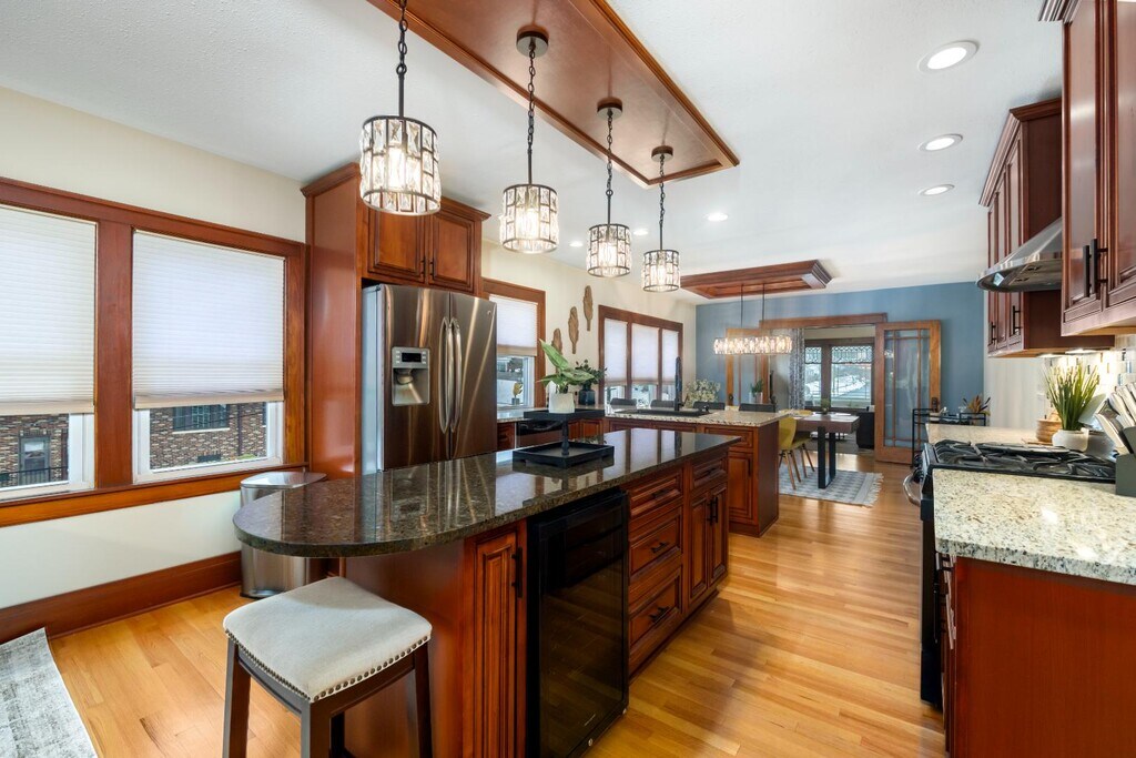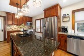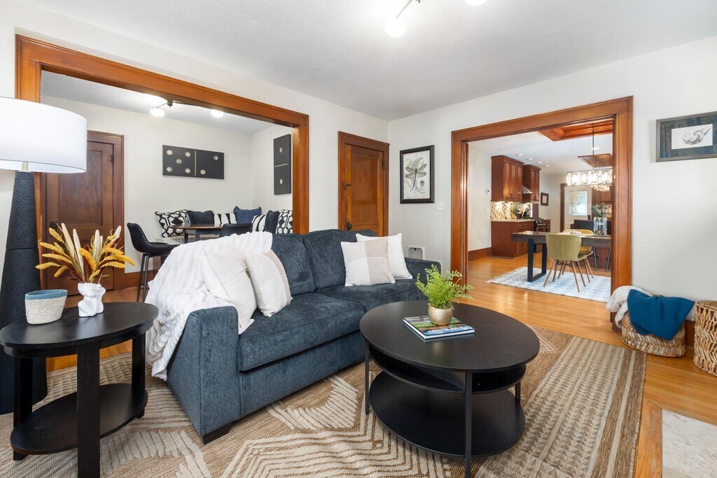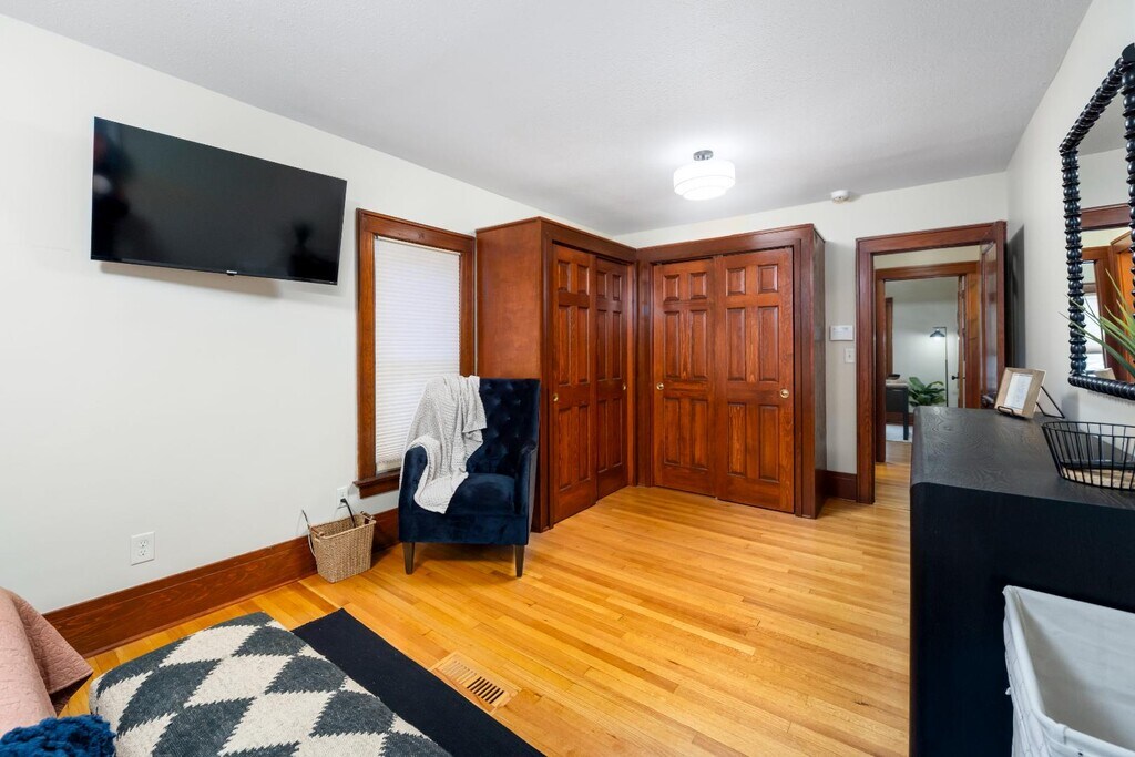 One-of-a-kind 2nd-floor apartment with open floor plan, picture window views, and a gas fireplace with built-ins. Stunning kitchen with stainless steel appliances, wine fridge, oversized fridge, and in-unit laundry. French doors lead to a cozy living room plus a bonus nook—perfect for office, library, or play space. Enjoy an updated bath with a deep tub and Bluetooth overhead light, and a spacious main bedroom with custom cherry closets. The second bedroom makes a great nursery or office. Added perks: built-in entry seating, additional storage room, and a basement gym area. Utilities included. Pets welcome ($50 per pet). One-car garage plus off-street parking. Small fenced yard for privacy and outdoor space. Enclosed front porch perfect for relaxing or morning coffee. Built-in rear porch/entry seating with coat hooks and shoe space. Blacktop driveway for easy access and parking. Rectangular lot with room for light landscaping or garden touches.