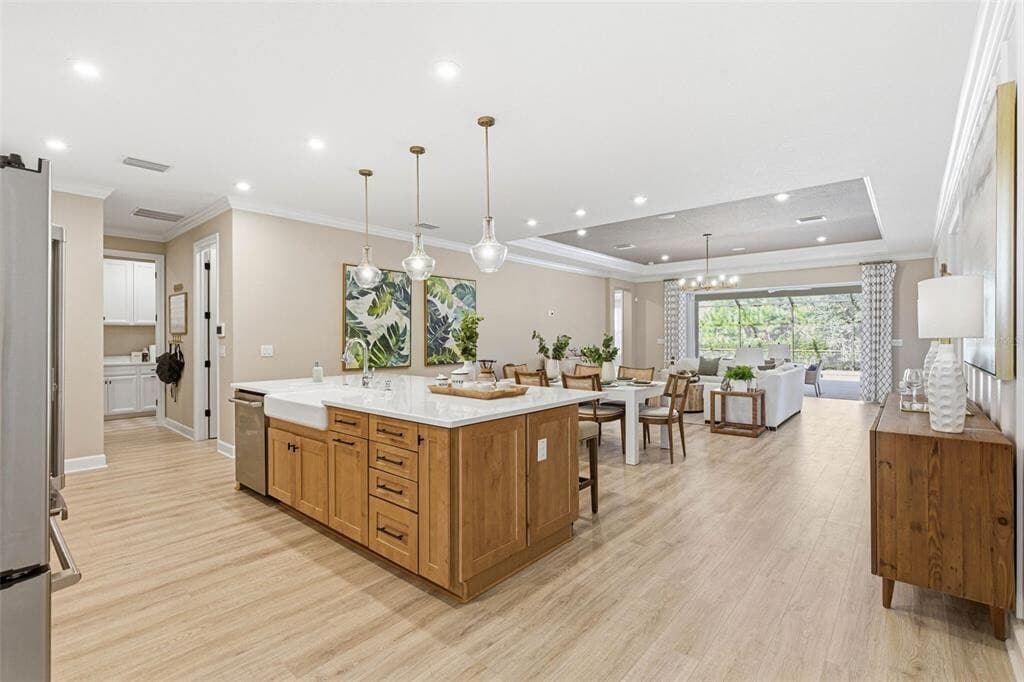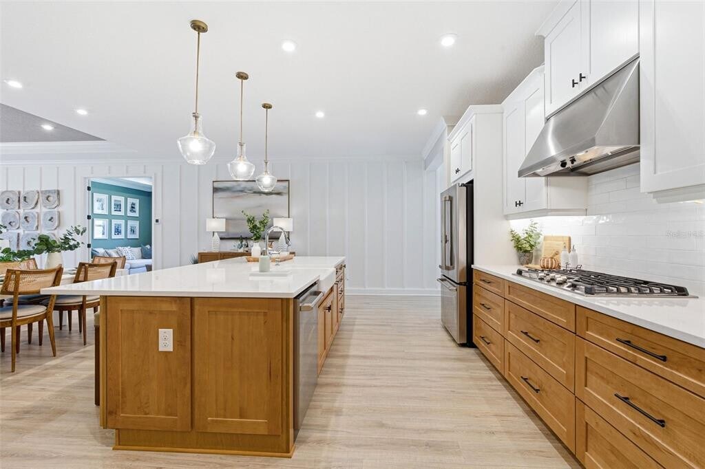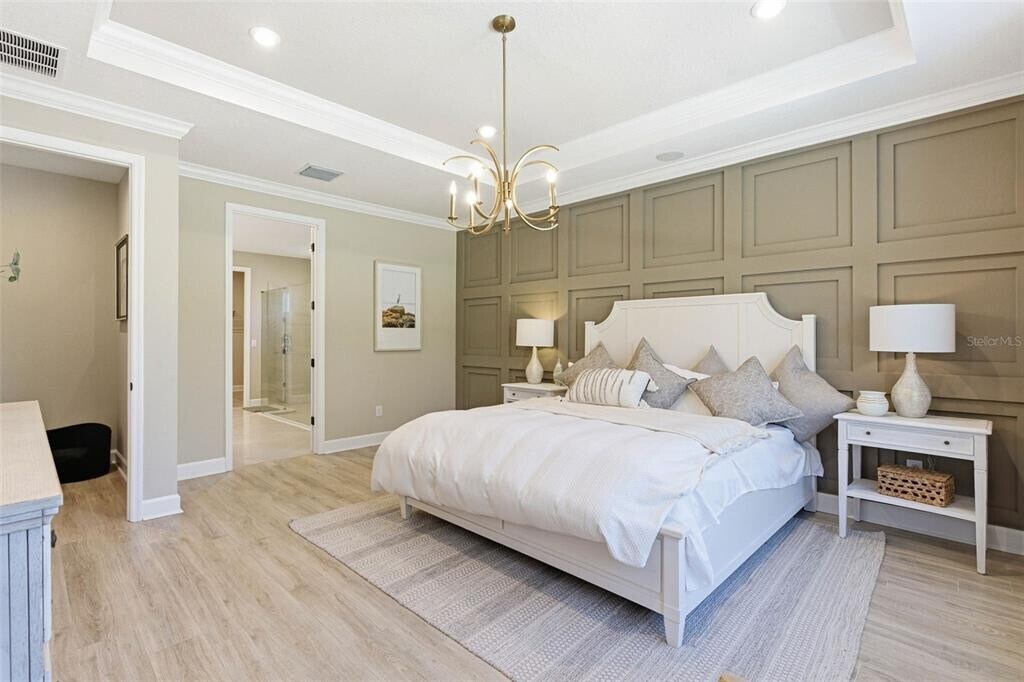 Welcome to this beautiful Saint Croix floor plan,former Model Home,never lived in,offering exceptional curb appeal,POOL and Outdoor kitchen and a refined,designer interior. The home comes with ALL FURNITURE AND DECORATION! This thoughtfully designed 2,921 sq. ft. home features 4 bedrooms and 4.5 bathrooms,with each bedroom offering a private en-suite bath and 3 Car Garage. An inviting foyer welcomes you and provides access to two secondary bedrooms. Beyond the foyer,the home opens to a spacious,open-concept beautifully finished gourmet kitchen with a center island overlooking the gathering room,perfect for entertaining. Pocket sliding glass doors lead to a large covered lanai,where you can enjoy outdoor cooking,spend time by the pool overseeing the view of the conservation lot,seamlessly blending indoor and outdoor living. Upgrades and structural options include tray ceilings,a gourmet kitchen,kitchen island knee wall,floor outlet,study in place of flex space with double French doors,8-foot interior doors,and pocket glass sliding doors. The owner’s suite features a deluxe bath with a rain showerhead. Additional features include a laundry room cabinetry and sink,outdoor kitchen with vent,private pool,built- in ceiling audio system and thoughtfully selected design enhancements throughout. River Landing community features resort-style amenities,including a heated pool with multiple entertainment areas,grills,clubhouse,fitness center,basketball and tennis courts,a playground,and a small soccer field. Conveniently located along the SR 56 extension,this community offers easy access to shopping,entertainment,and dining options. Don't miss out and schedule your private tour today! MLS# TB8472482