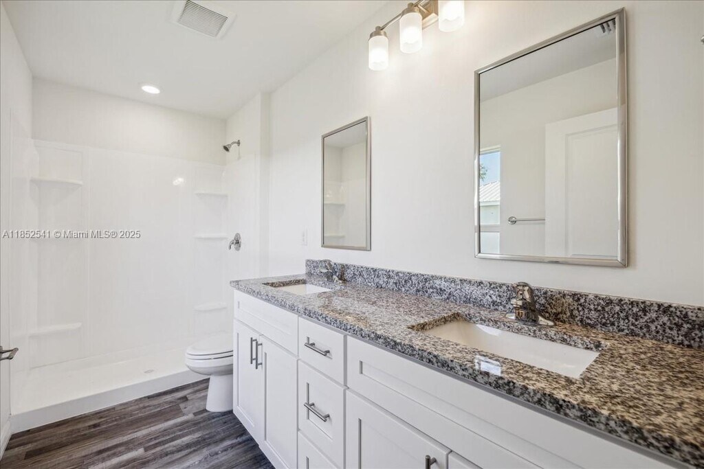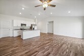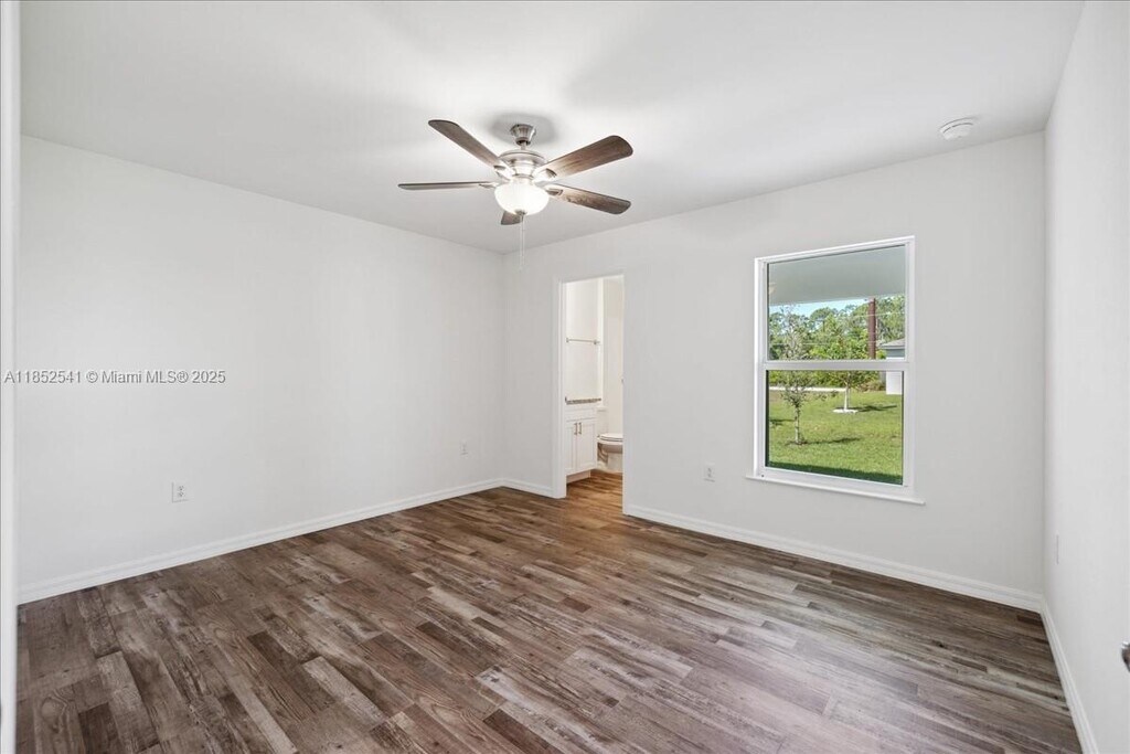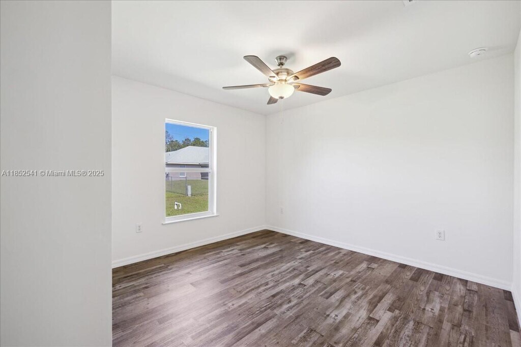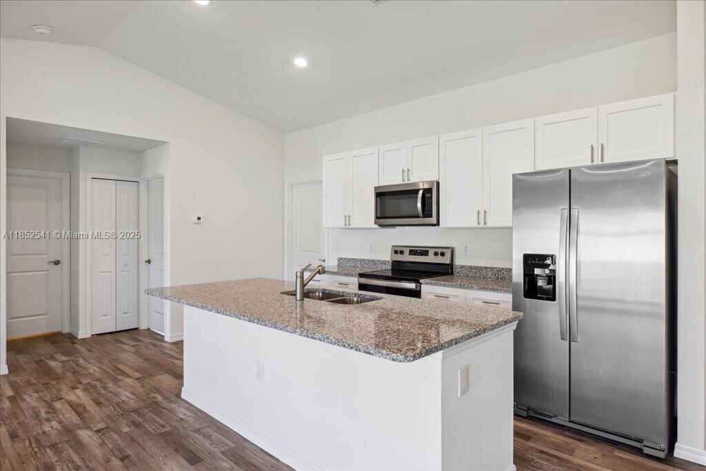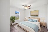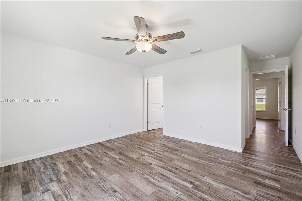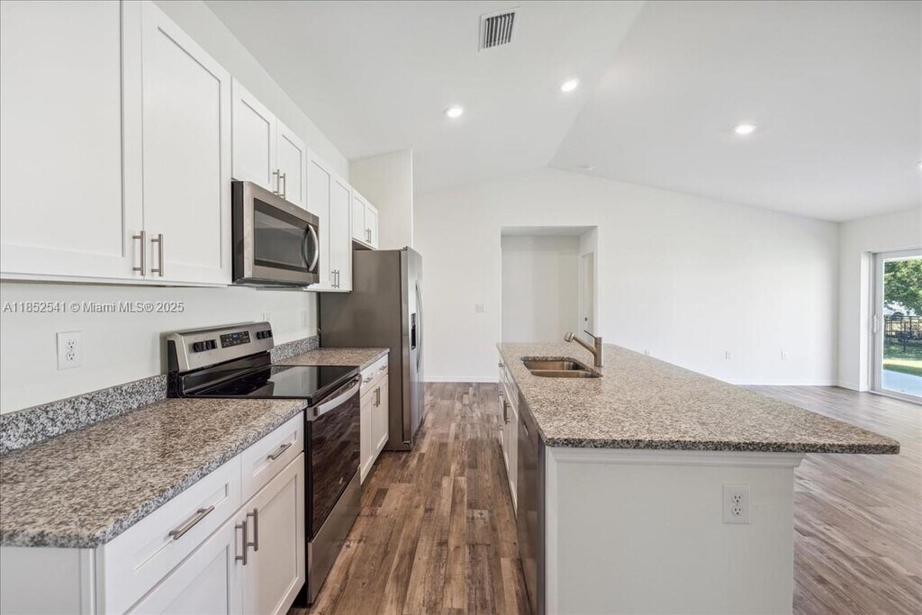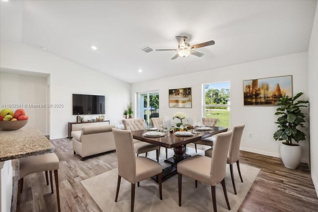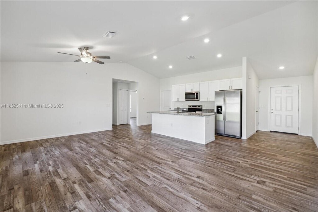Move-in ready!!! This stunning property features 4 bedrooms and 3 full bathrooms, boasting not one but two master suites! The expansive layout with a vaulted ceiling offers an ideal setting for entertaining. Enjoy the elegance of high-end shaker cabinets in the kitchen, complemented by plank flooring throughout. Stainless steel appliances add a touch of sophistication. Step out to a generous covered lanai overlooking the spacious backyard. Plus, benefit from a full irrigation system and the convenience of impact doors and windows, eliminating the need for shutters.