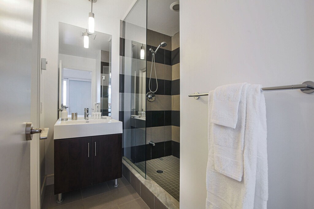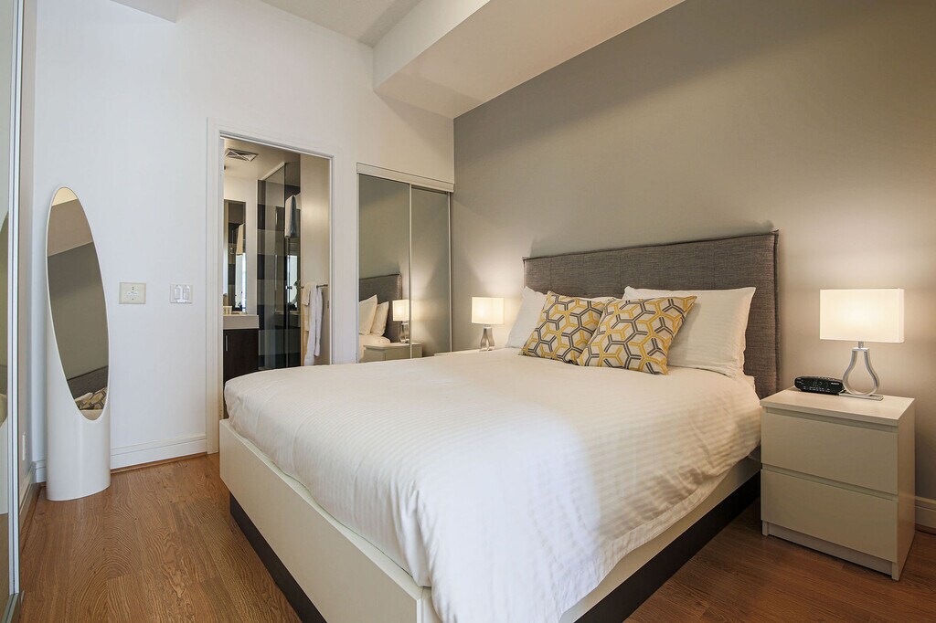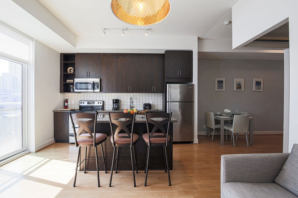 Feel at home in this conveniently located Old Toronto apartment, steps from the St. Lawrence Market, Distillery District, and the Financial District. This full block modern development offers a large and bright suite in a quiet neighborhood, overlooking St. James Park and the downtown core. This apartment features a generous, fully equipped eat-in kitchen with stainless steel appliances and a glass top stove, as well as formal dining for 3-4. The bathroom has a double sink and step-in shower. Enjoy the Canadian-made upholstery, 2 large front hall closets for extra storage, and in-suite washer and dryer. Central air conditioning and heating are included. Gym, meeting room, and party room access are available, as well as a digital plus cable package. Toronto's transit system and the Don Valley Parkway are easily accessible from this apartment. Smoking is not allowed. A dedicated desk is provided, along with unlimited high-speed internet and local home phone service. [SI]